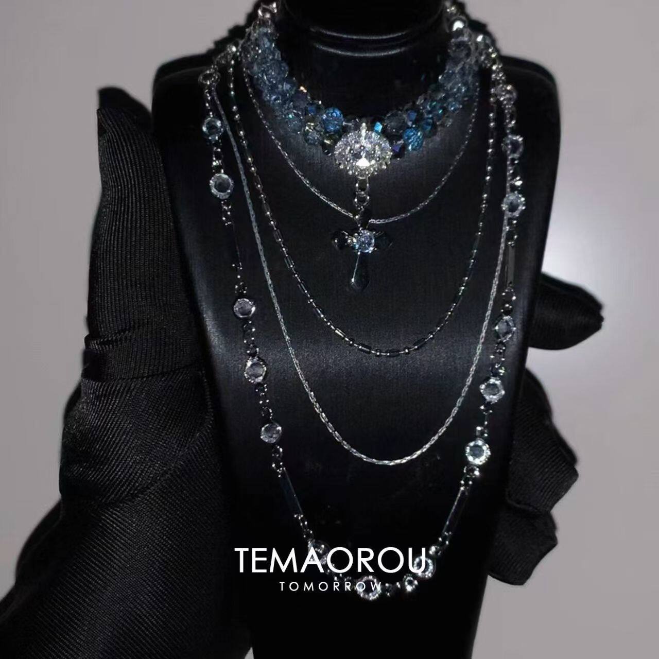 diy自制干净清冷色多层银蓝灰闪钻十字架项链女晚会配饰宴会颈链