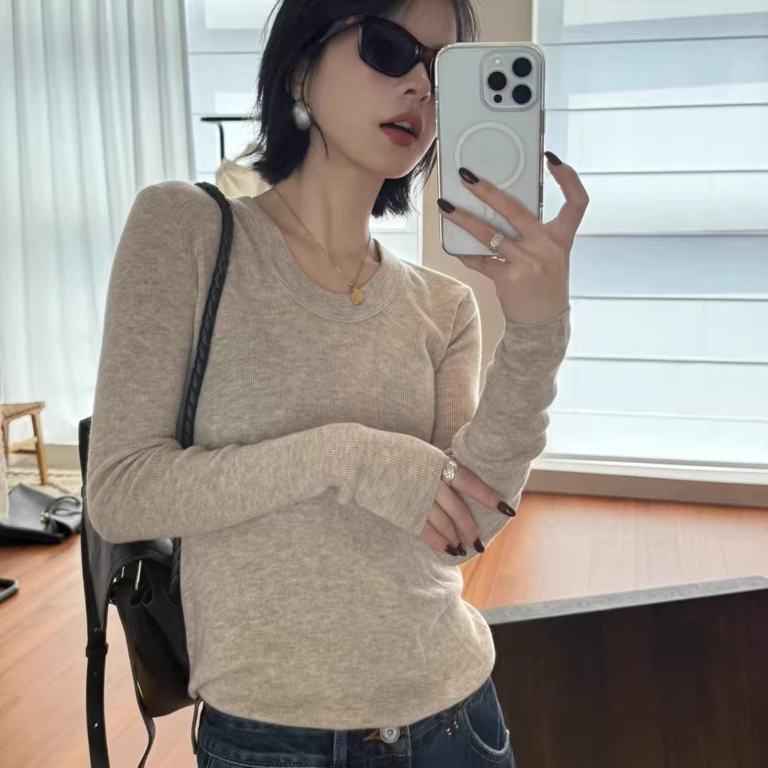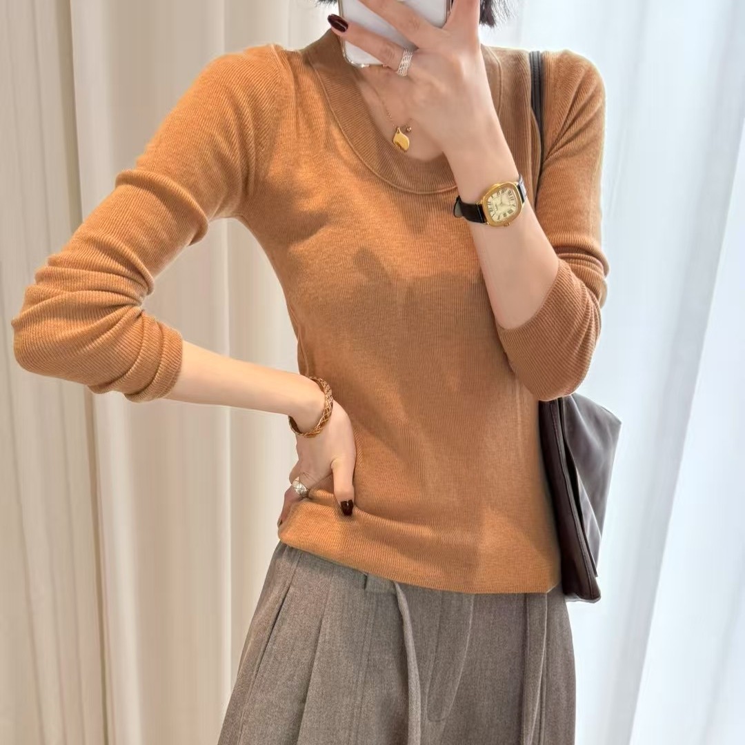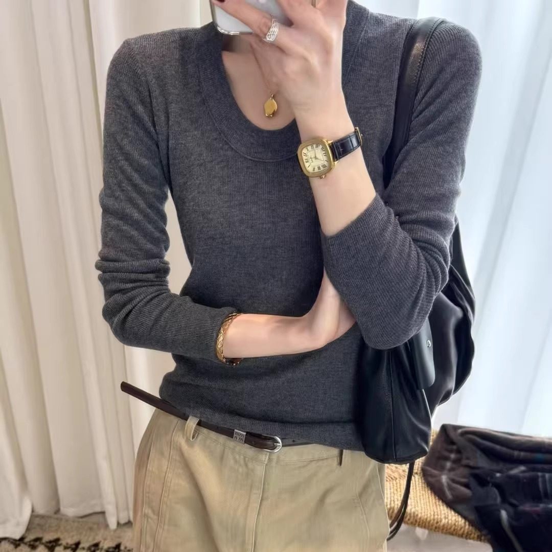 超好穿纯色U领100%羊毛针织衫女长袖弹力显瘦打底衫女2025秋冬款