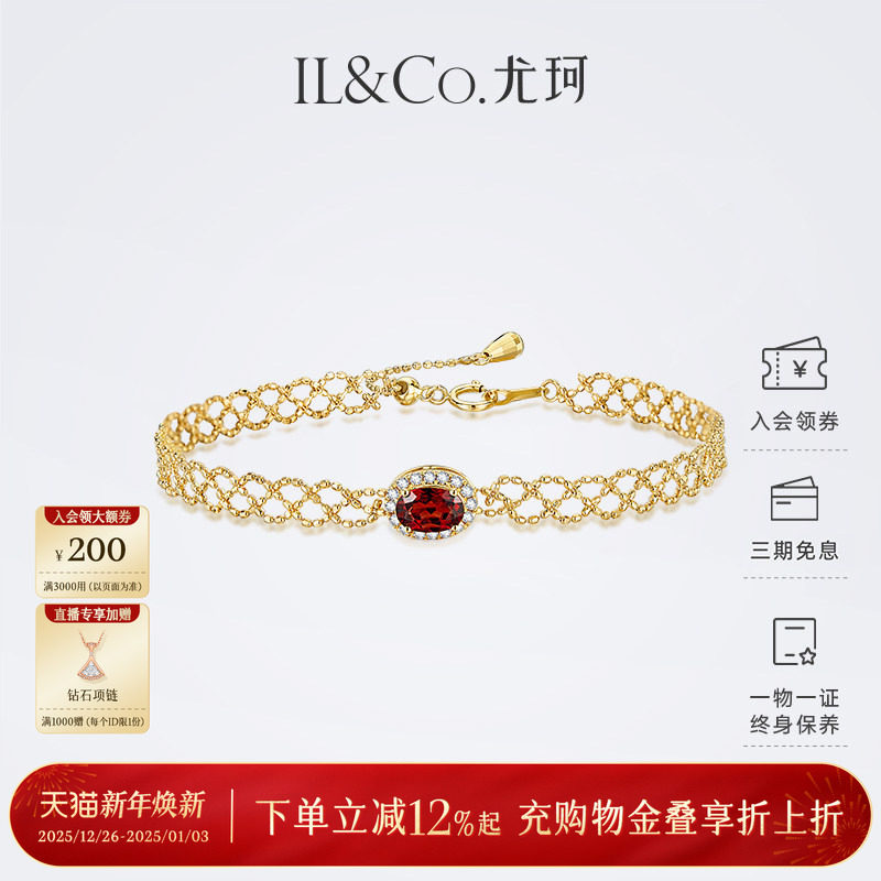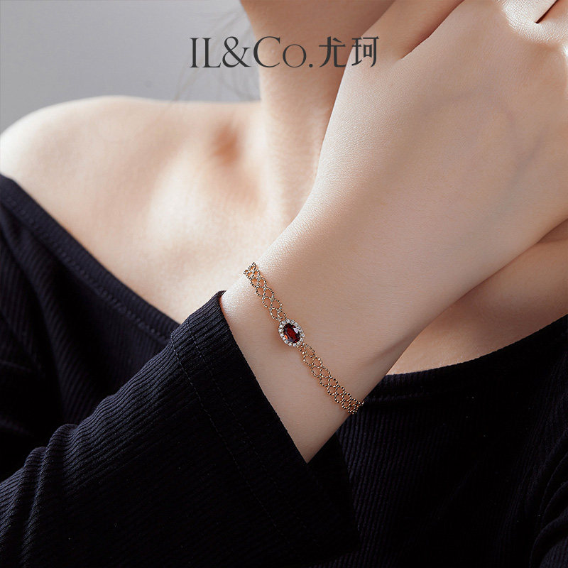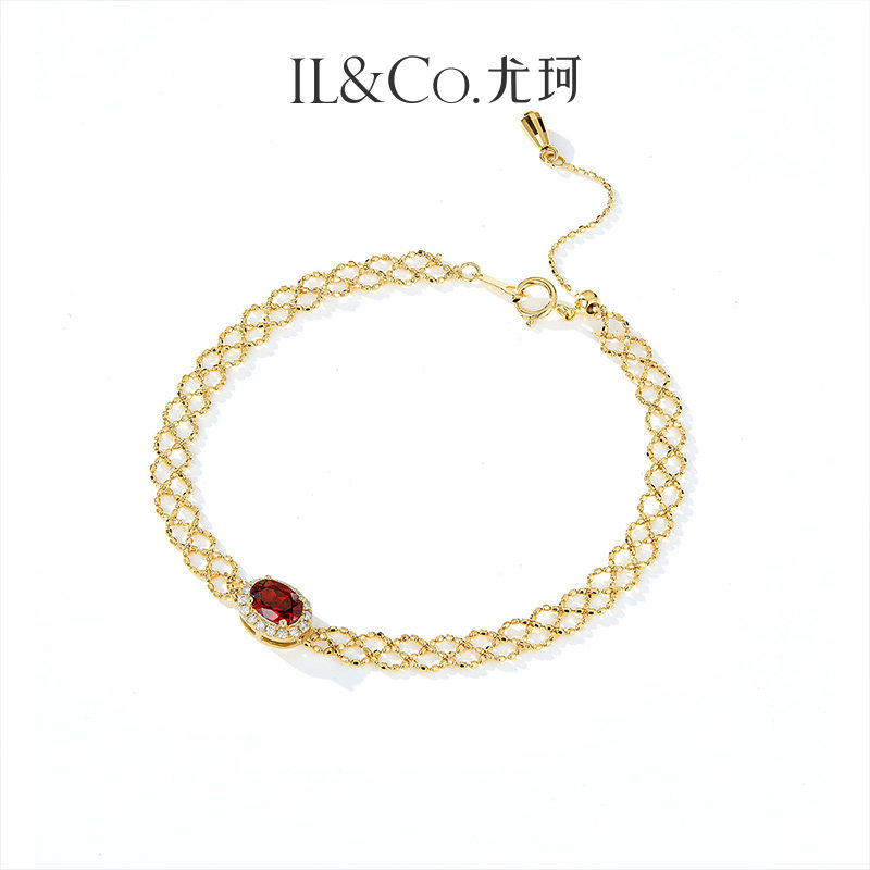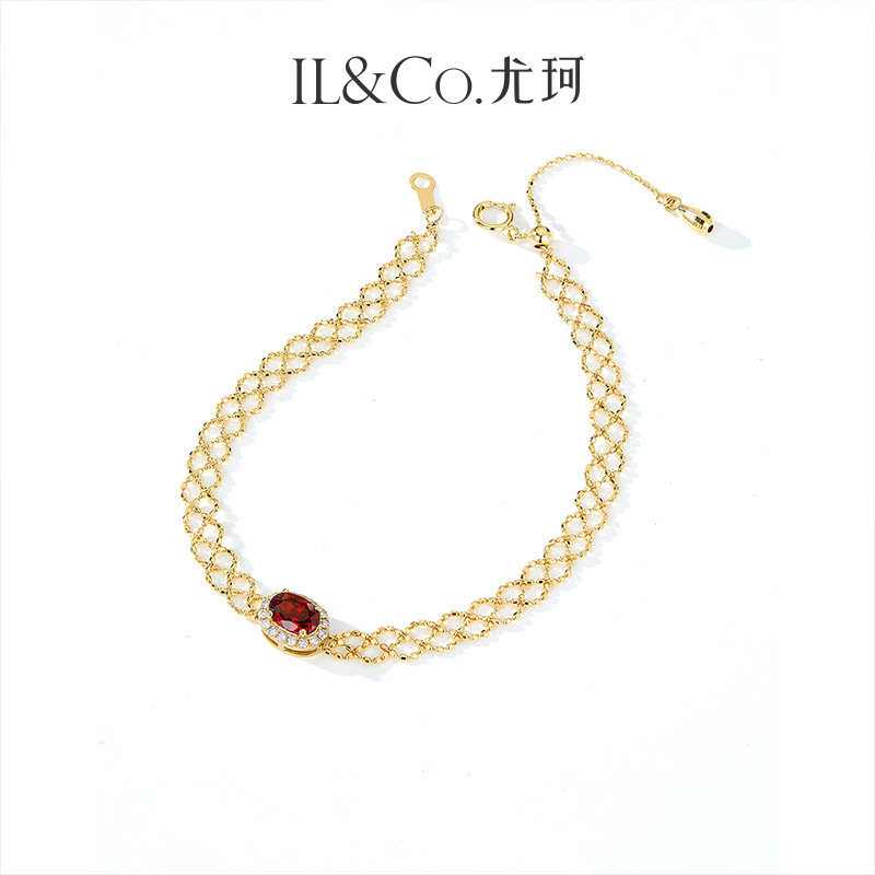 ILCO尤珂「花丝蔻 」黄18K金天然石榴石钻石围镶镂空编织设计手链