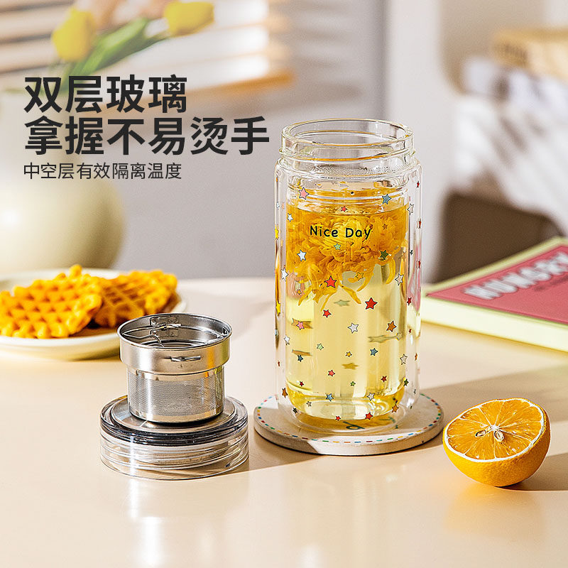摩登主妇双层玻璃杯带盖咖啡杯子办公室水杯耐高温茶水分离泡茶杯