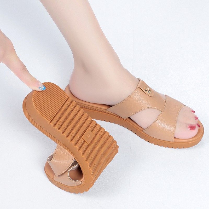 2024年新款夏平底品牌软皮软底坡跟凉拖鞋中老年女鞋妈妈凉鞋低跟
