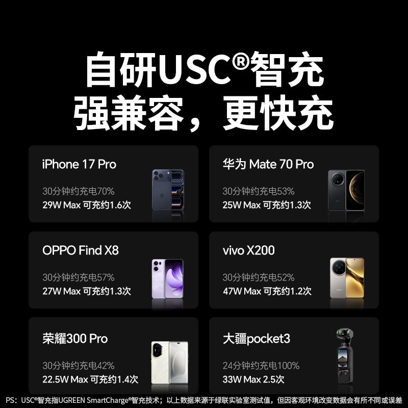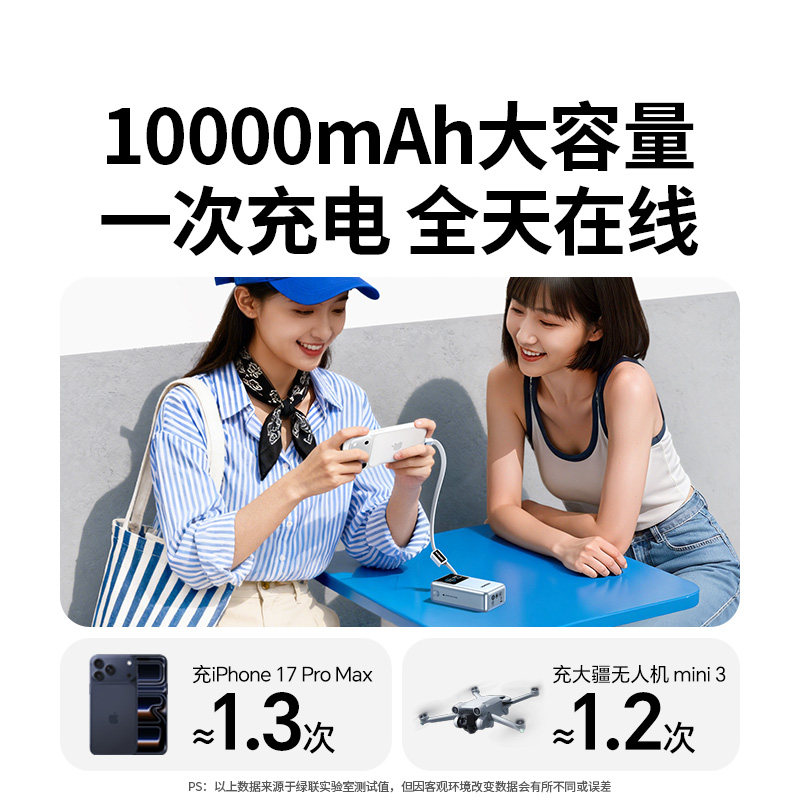 【充电宝3C认证可上飞机】绿联55W自带线能量湃2025新款便携10000毫安适用于苹果小米17快充移动电源官方