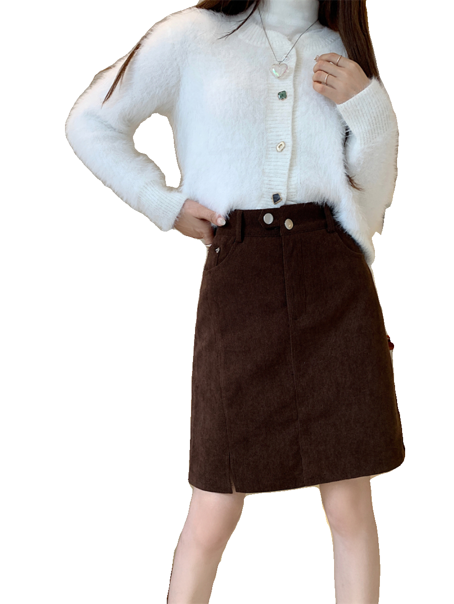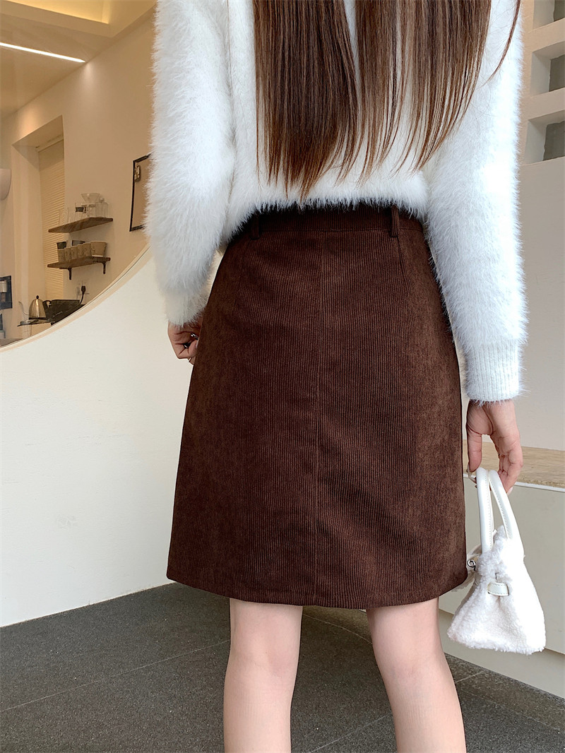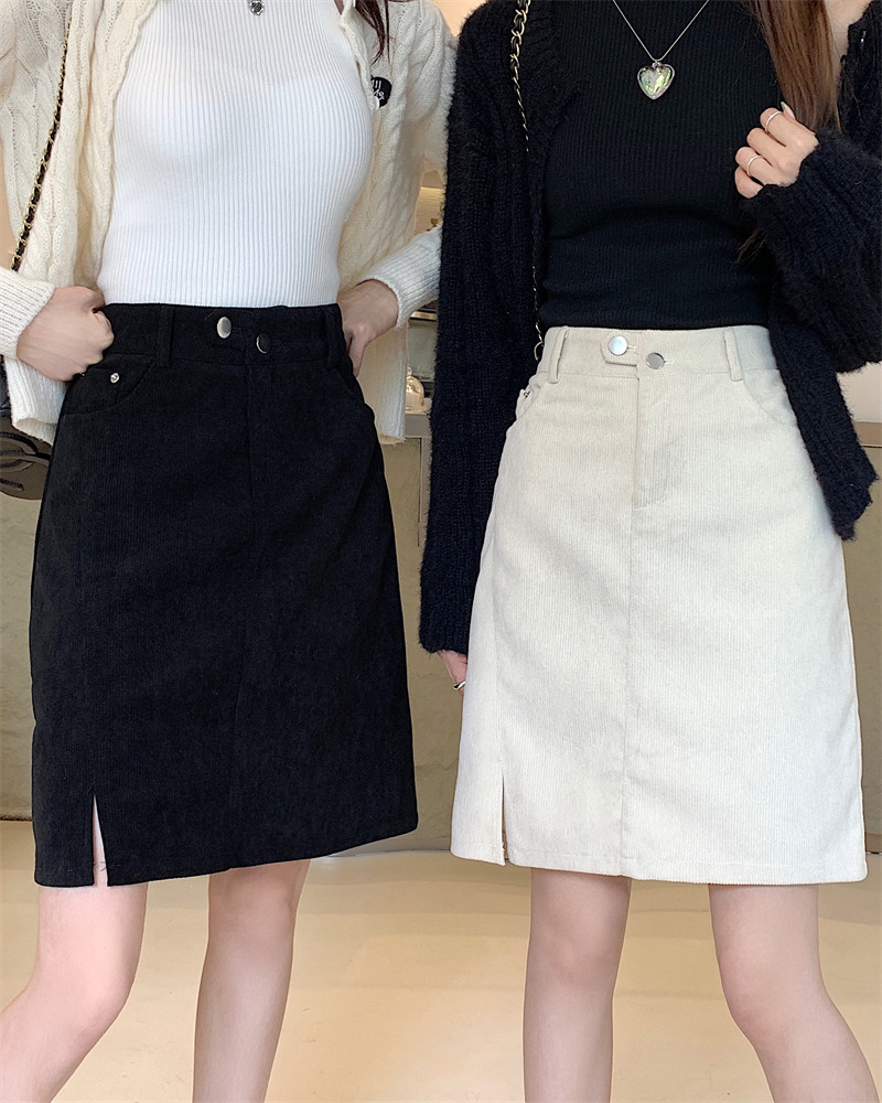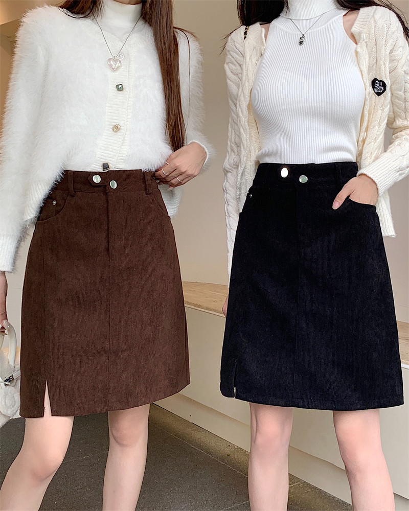 大码高腰开叉灯芯绒半身裙女秋冬小个子a字半裙复古包臀中长裙子
