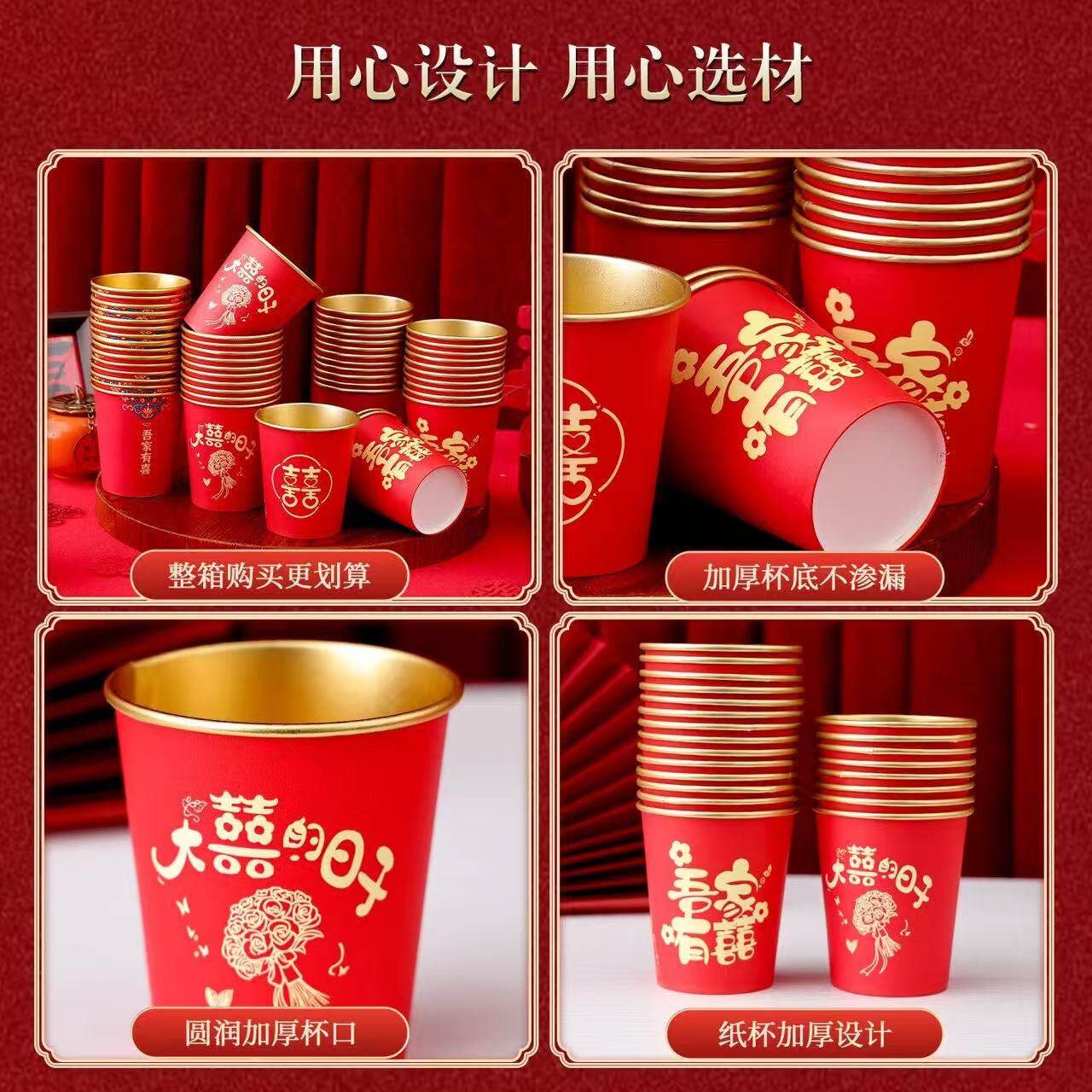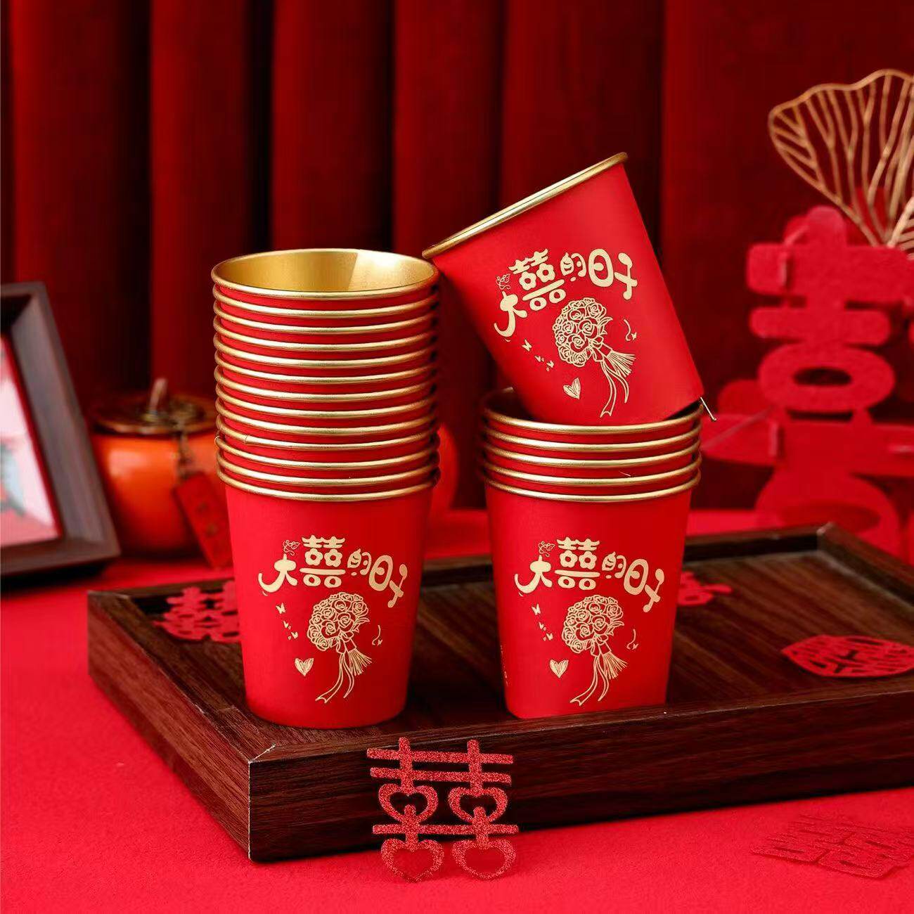 婚庆金箔杯一次性纸杯子加厚婚礼喜杯婚宴水杯家用红色杯子订婚