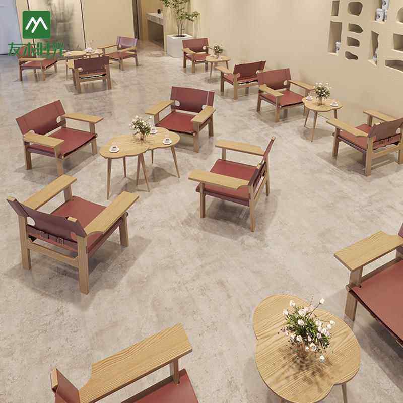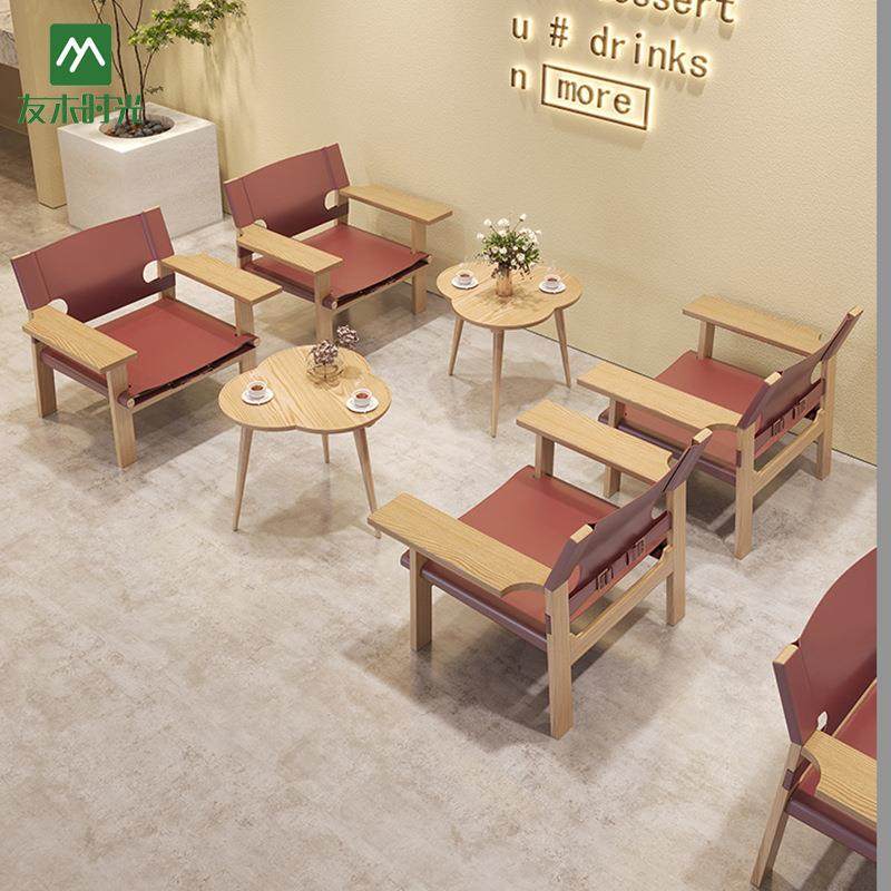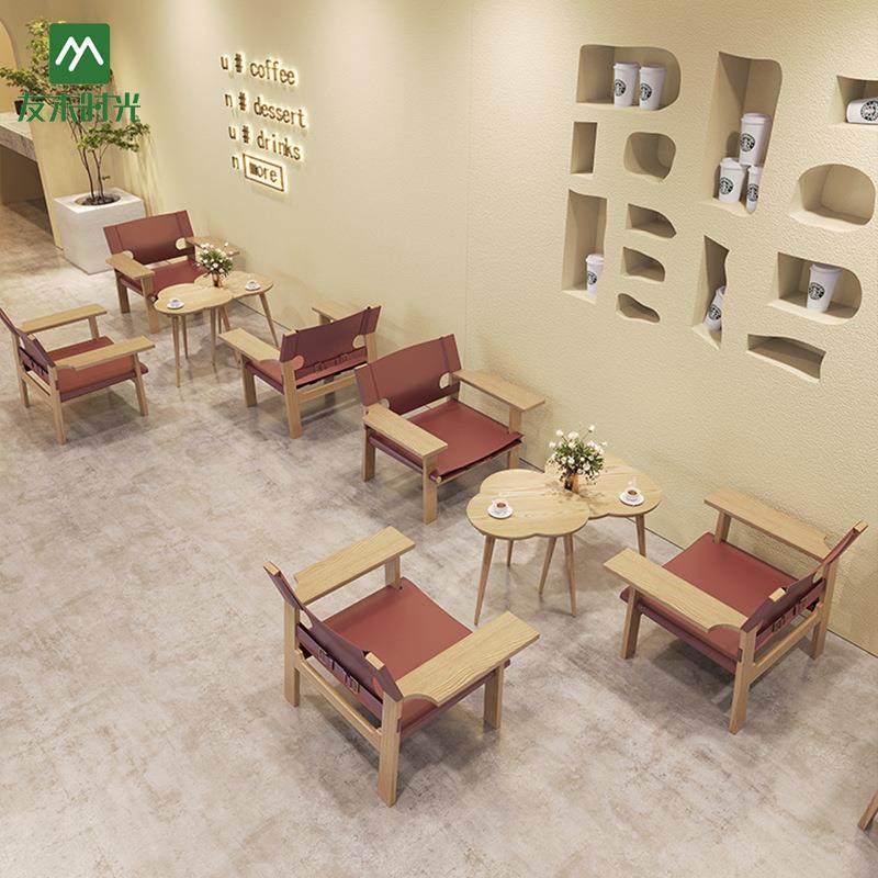 创意设计烘焙店奶茶店马鞍革休闲洽谈沙发椅实木咖啡厅桌椅组合
