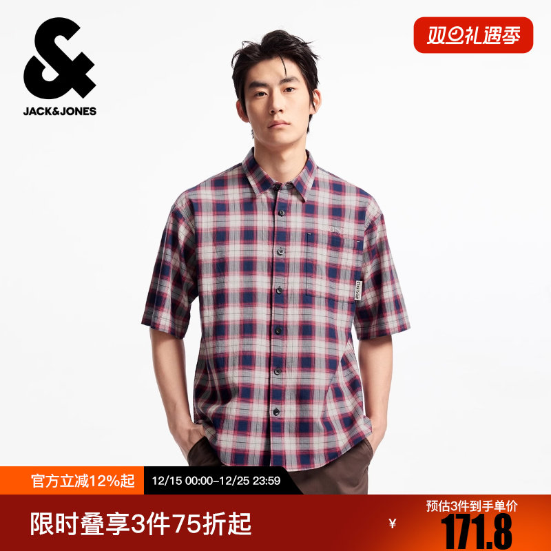 杰克琼斯男装冬新款时尚英文刺绣格纹翻领宽松休闲短袖衬衫上衣
