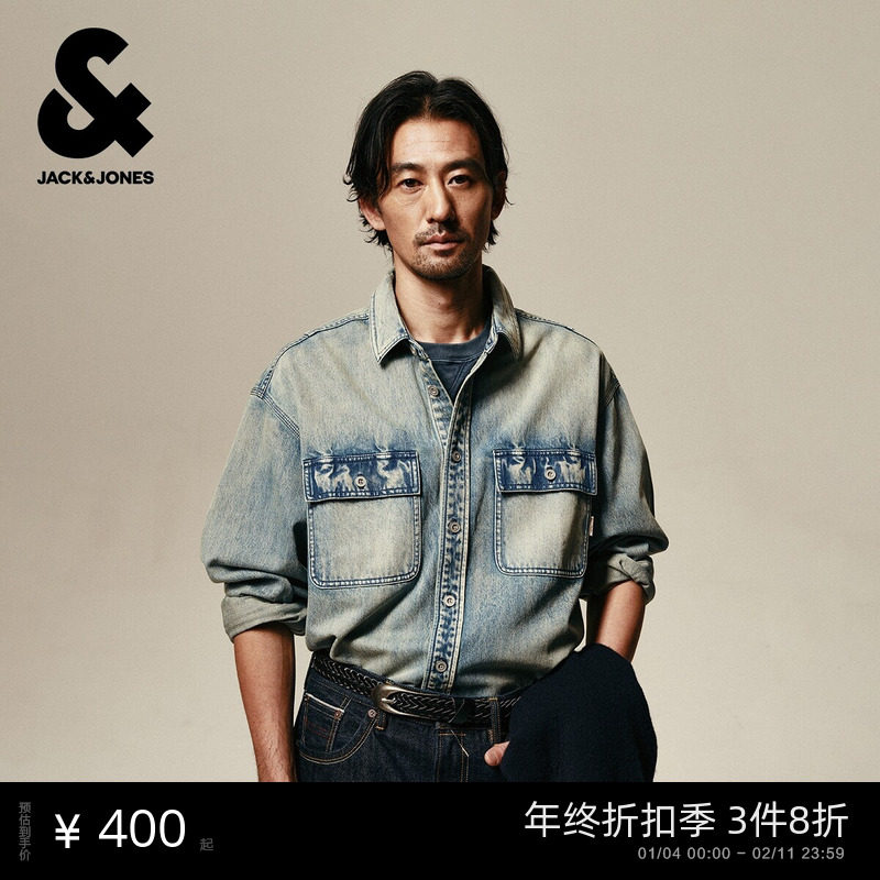 杰克琼斯男装秋季衬衫外套上衣翻领宽松版型水洗字母刺绣牛仔面料