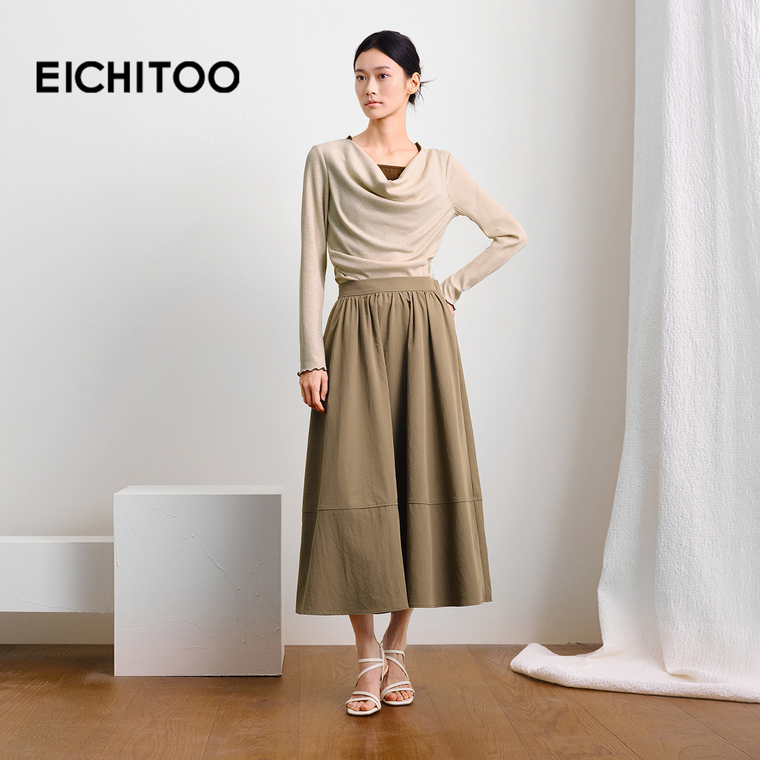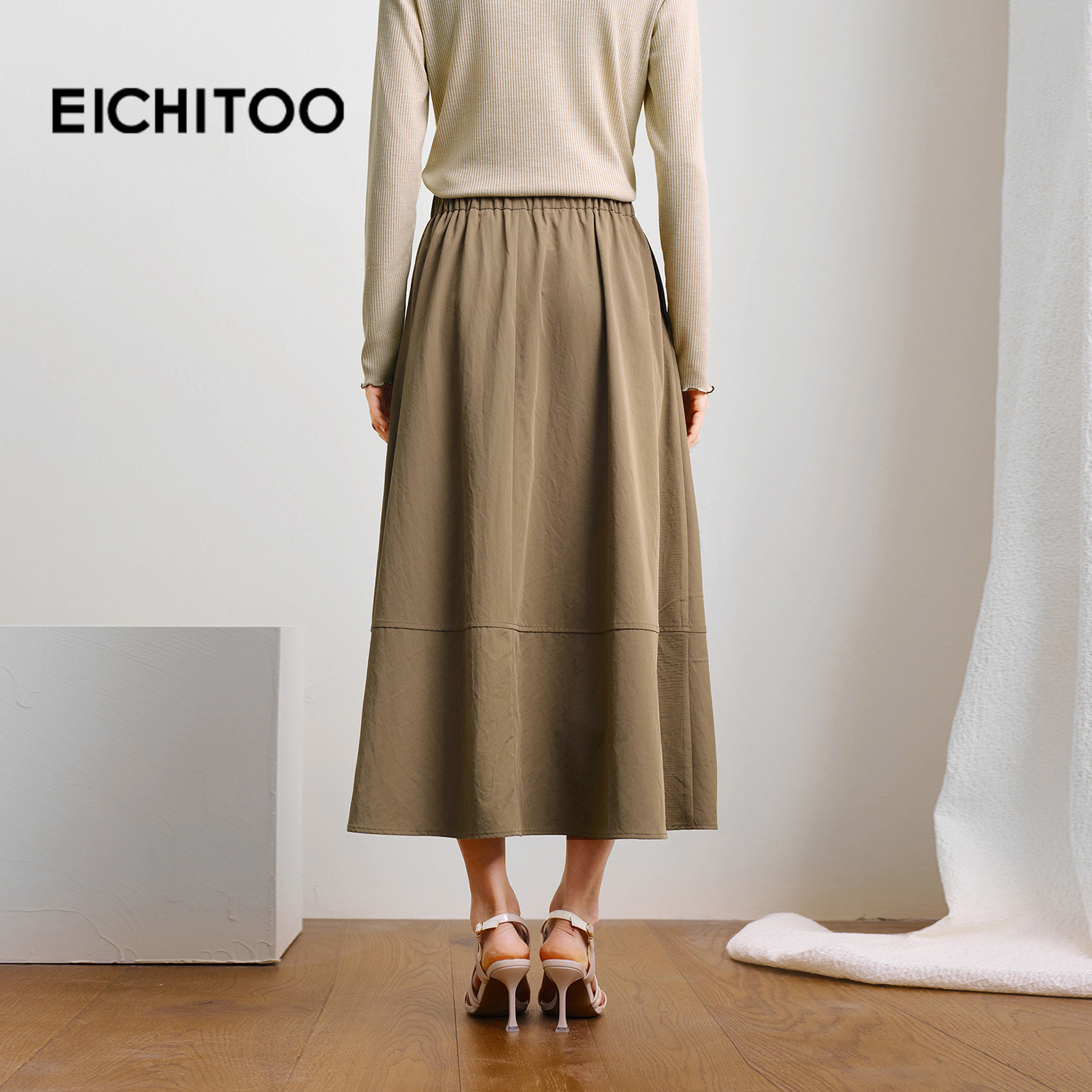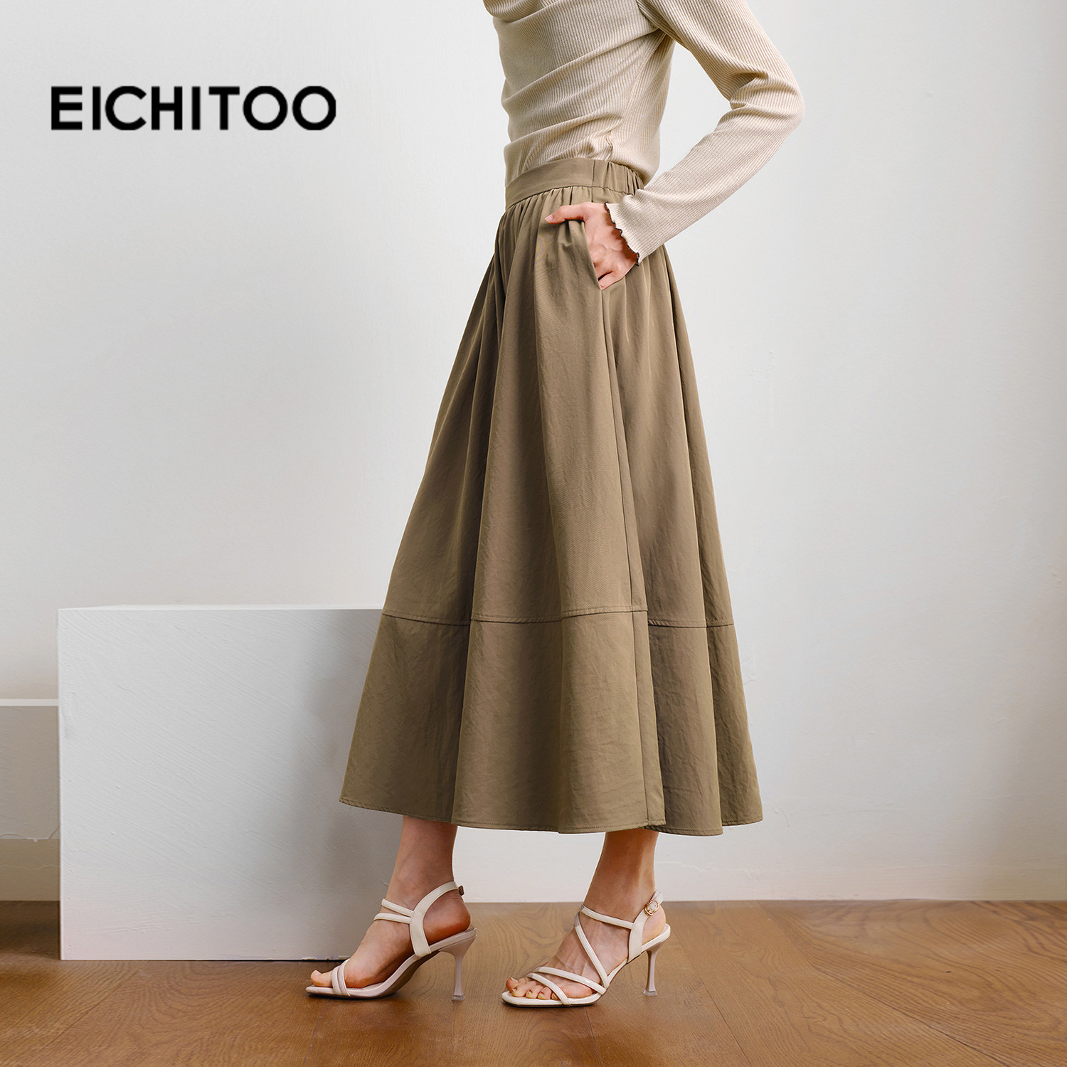 爱居兔卡其色通勤半身裙女2025年秋季新款百搭飘逸A字裙中长裙