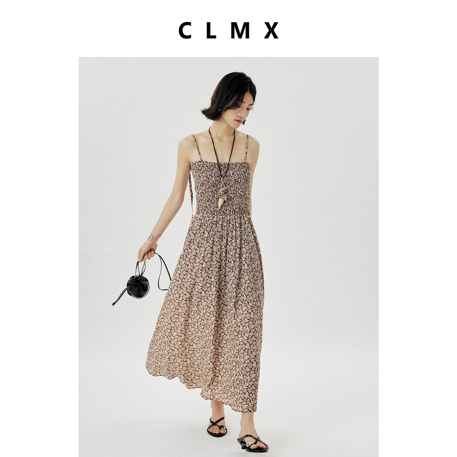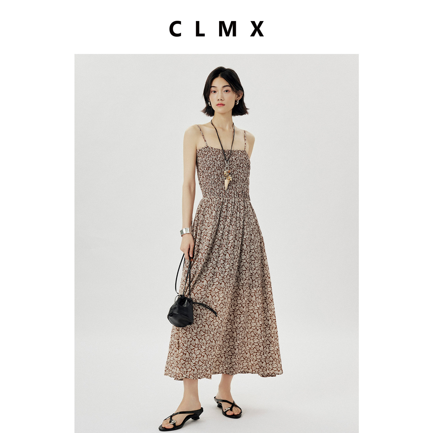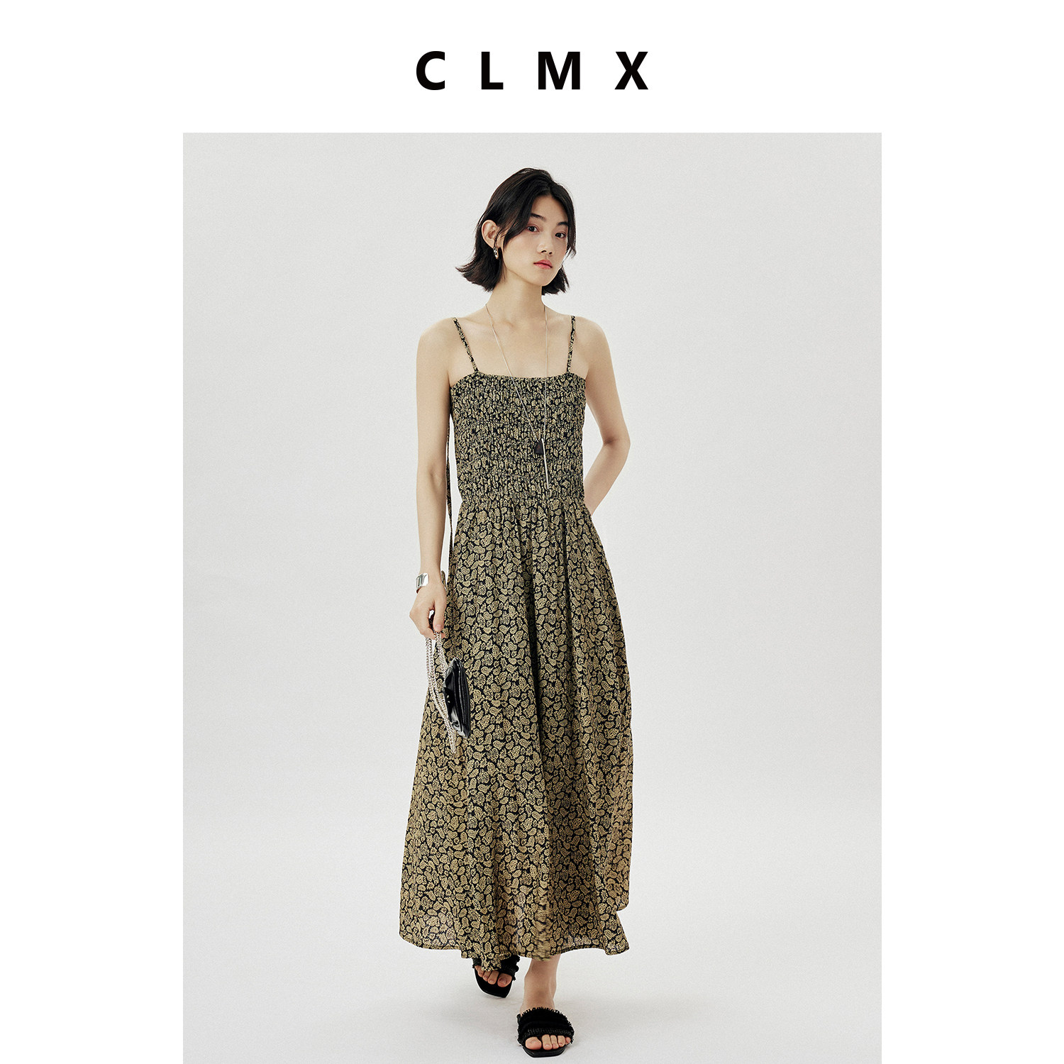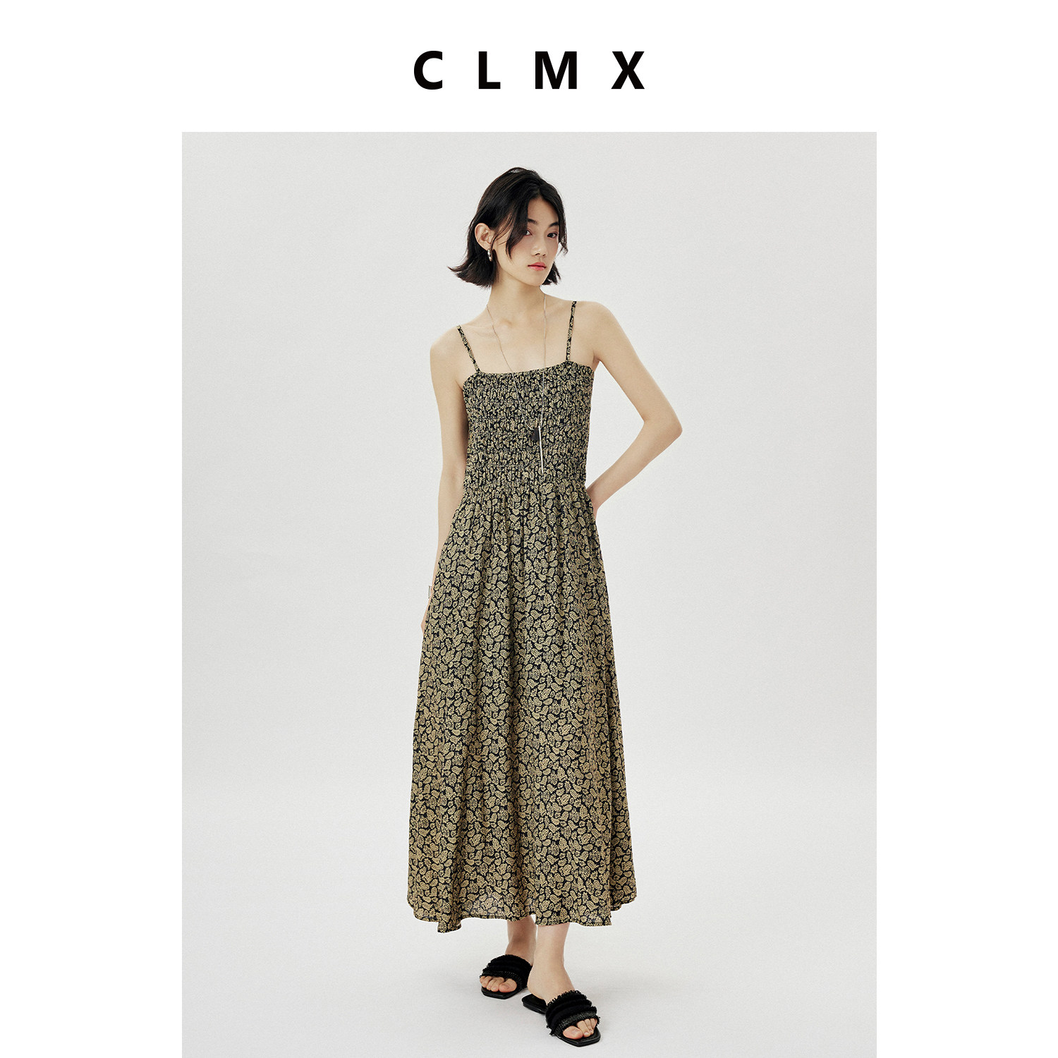 CLMX夏季气质通勤A字裙粘胶锦纶混纺面料干爽透气碎花吊带连衣裙