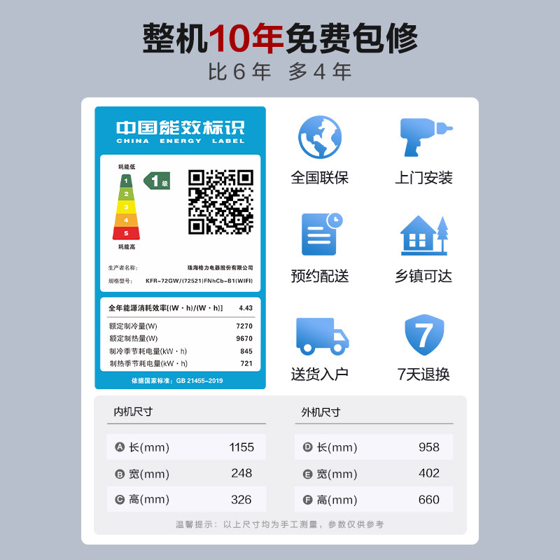 【格力空调】新一级变频冷暖智能3匹家用客厅大挂机U雅官方正品