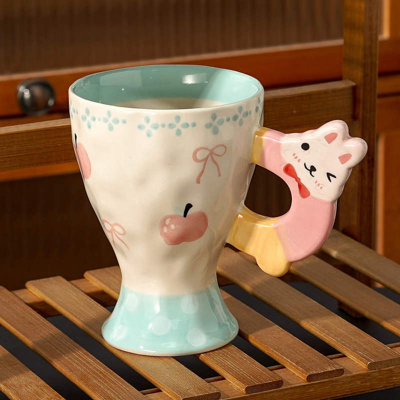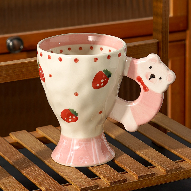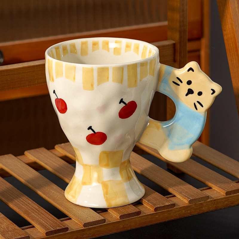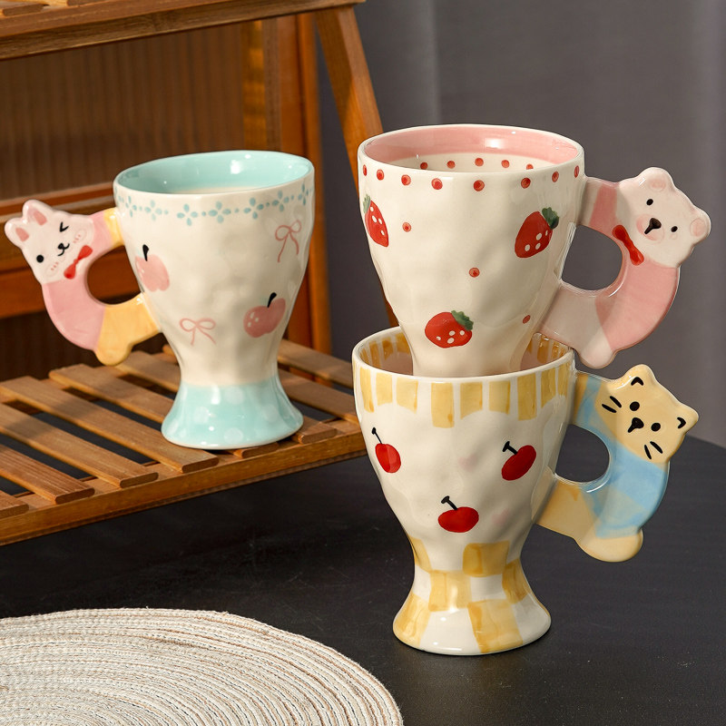 创意手绘牛奶杯可爱动物把手陶瓷杯草莓樱桃少女心水杯咖啡马克杯