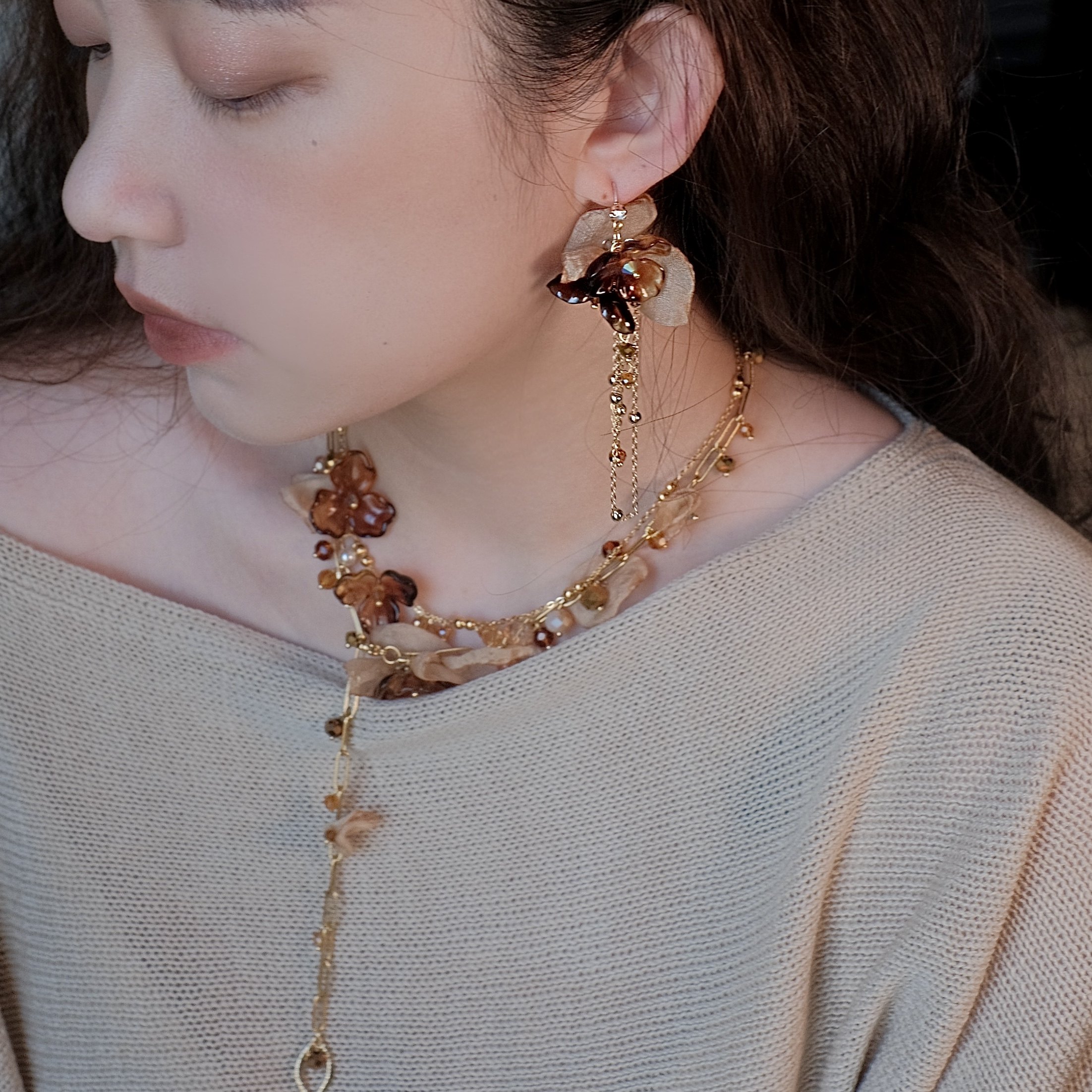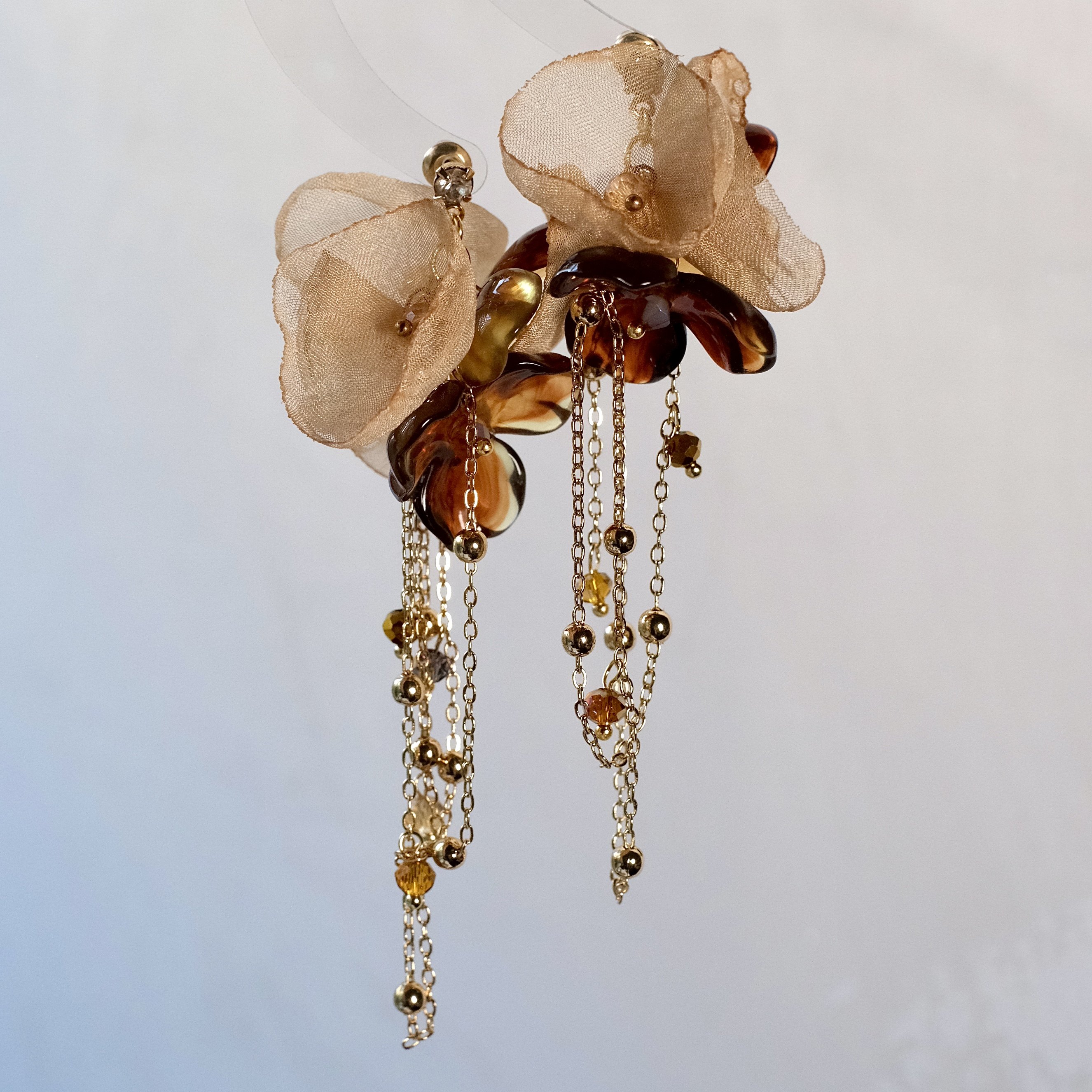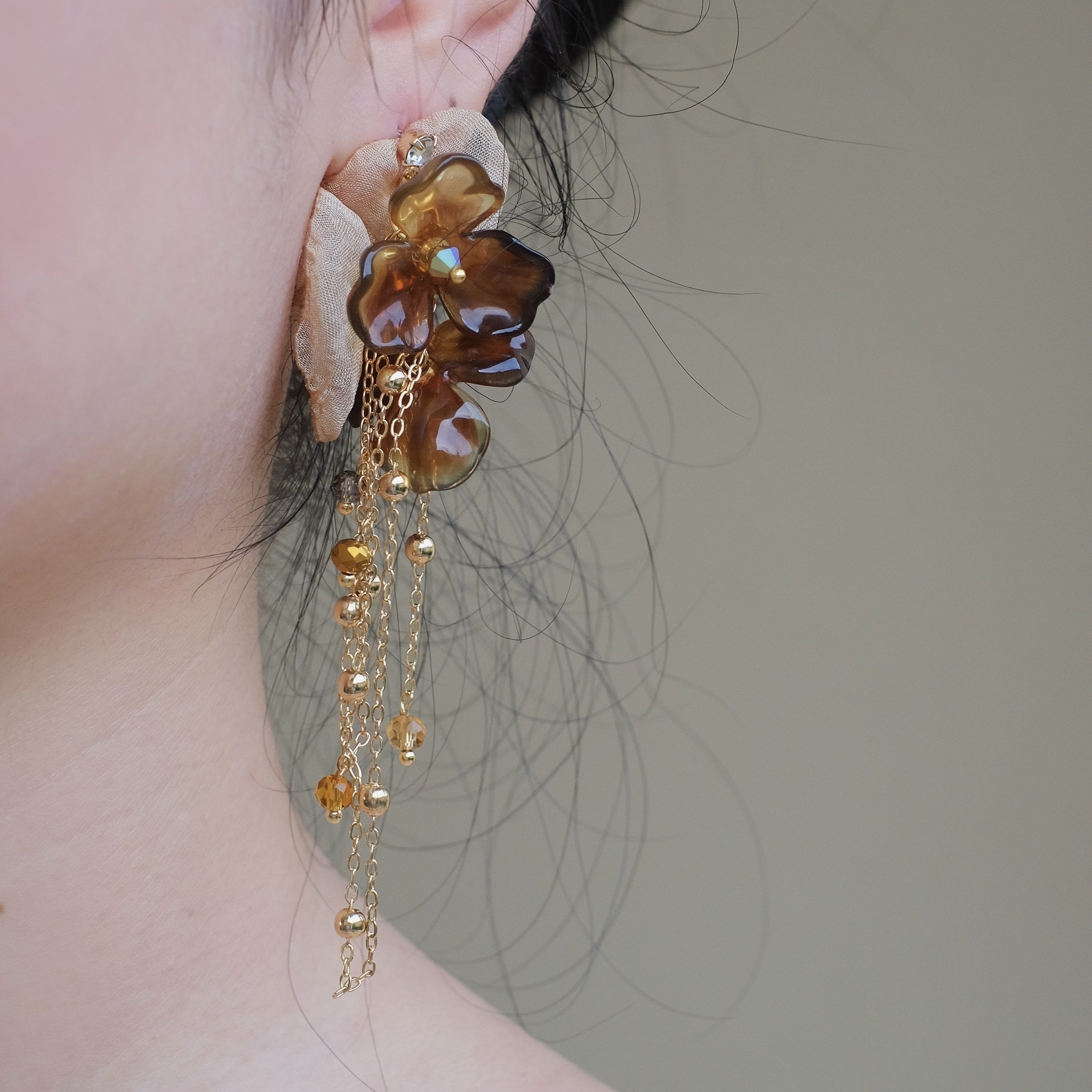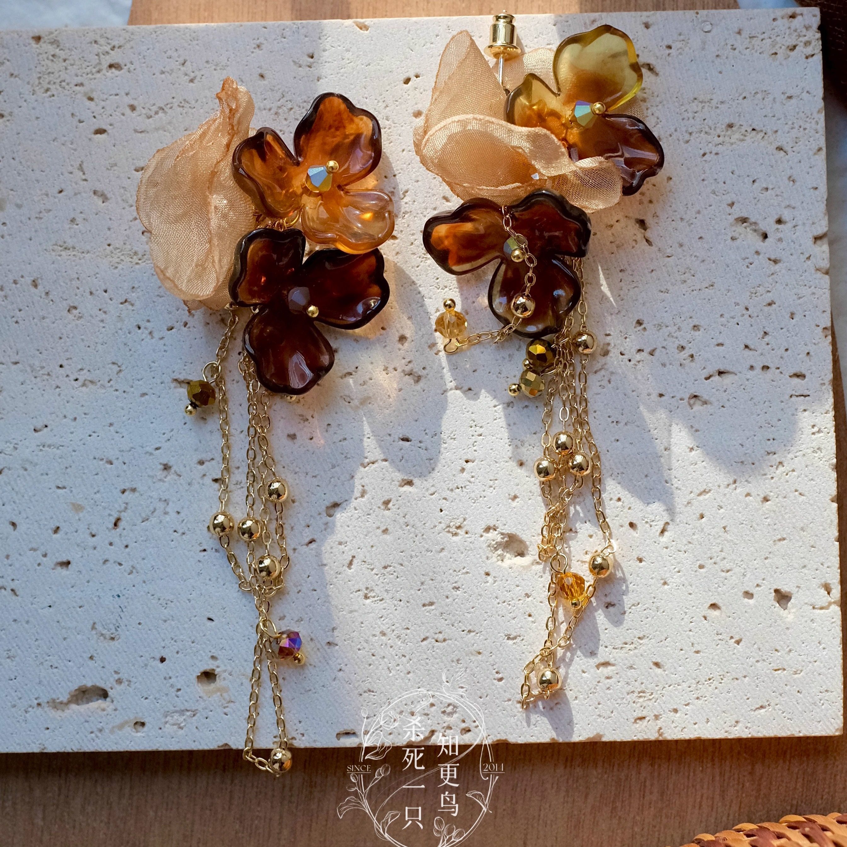 《琥珀生花》原创新中式复古清冷感咖色长款花朵流苏耳环耳夹耳饰