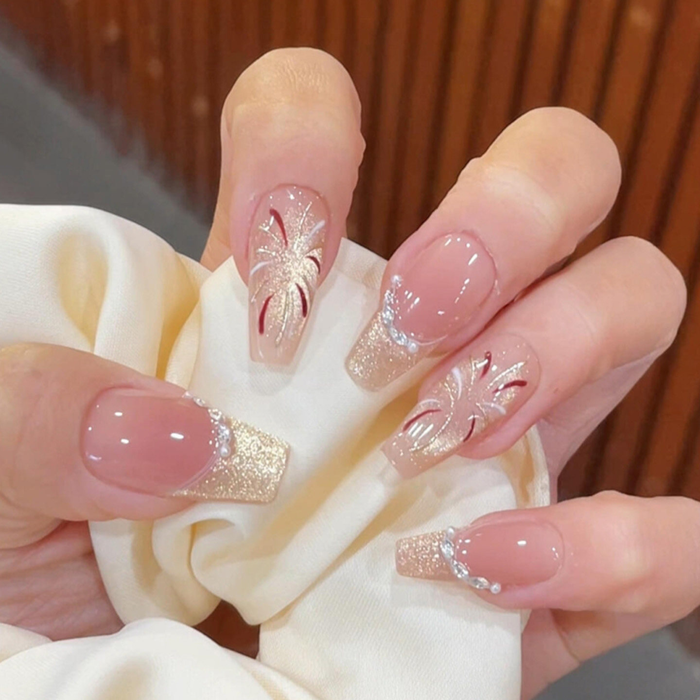红色系美甲穿戴甲手工中长款过年2026新年款腮红新娘镶钻烟花法式