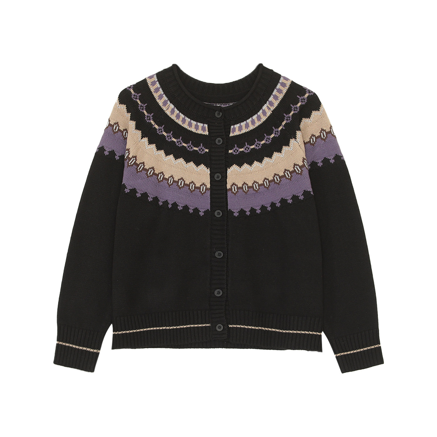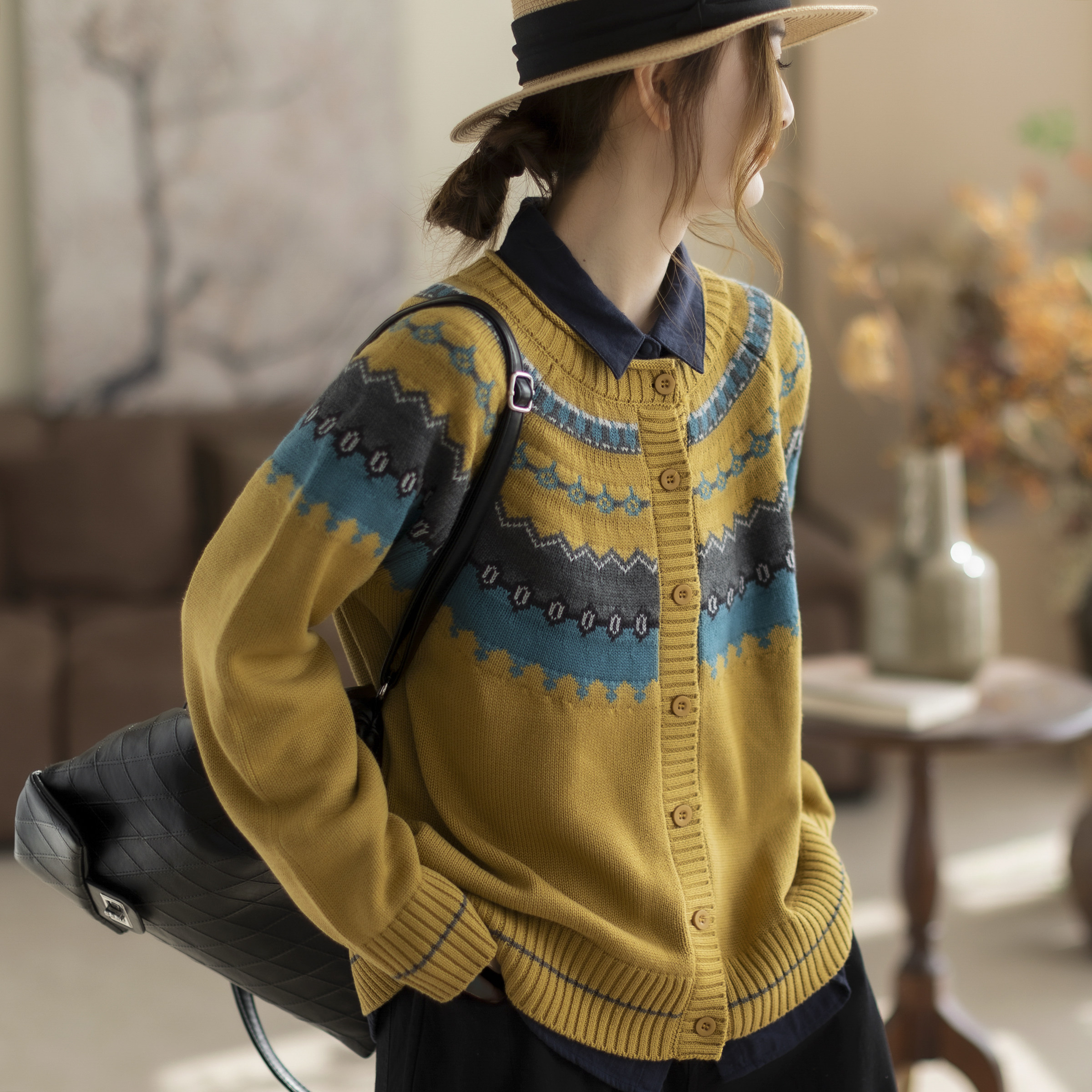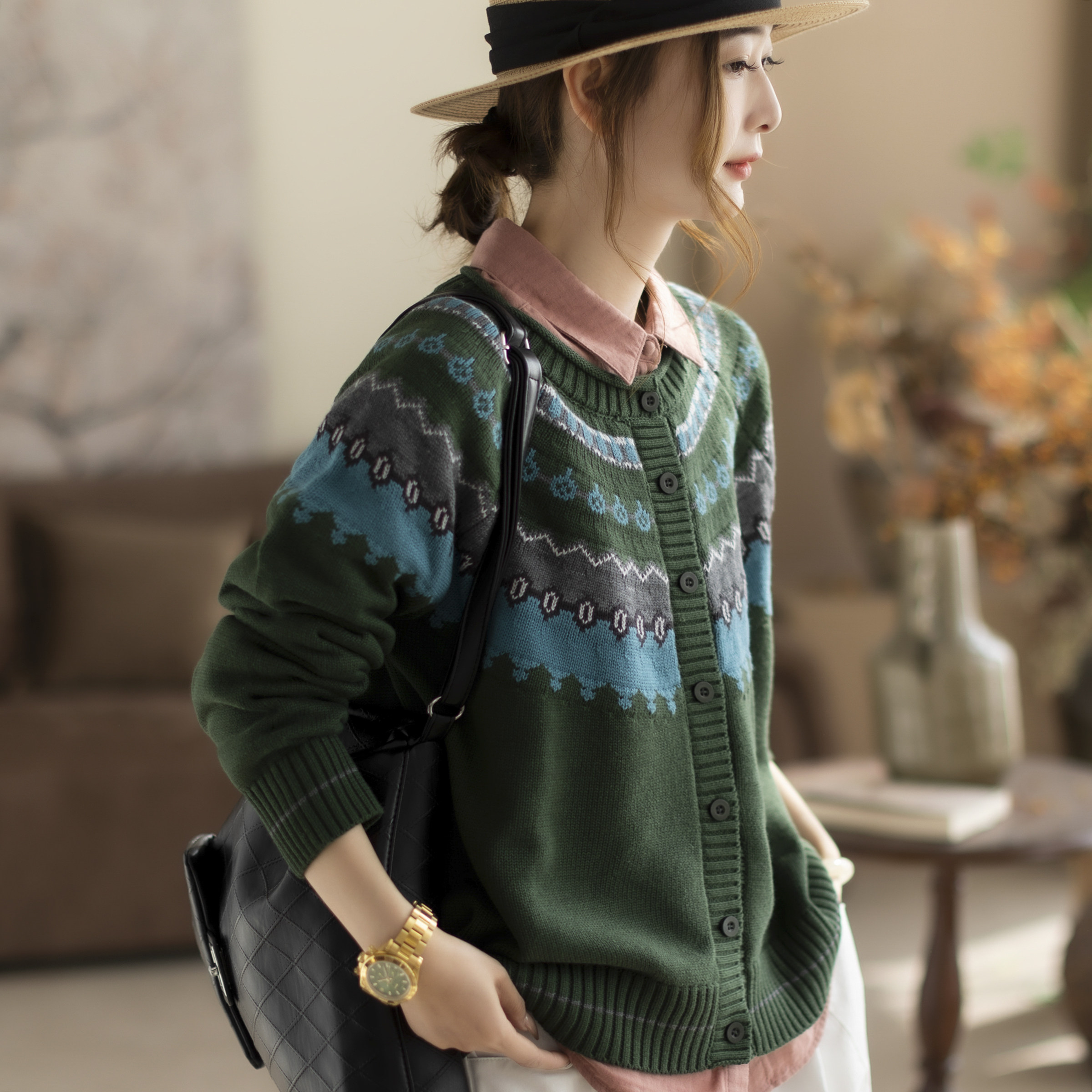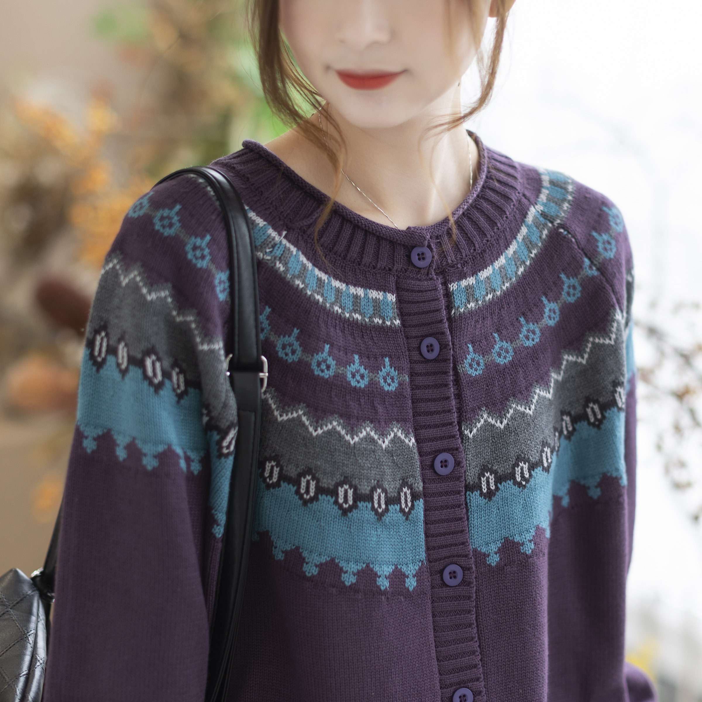咖咪羽春秋新款圆领开衫韩版宽松复古设计感撞色针织外套女