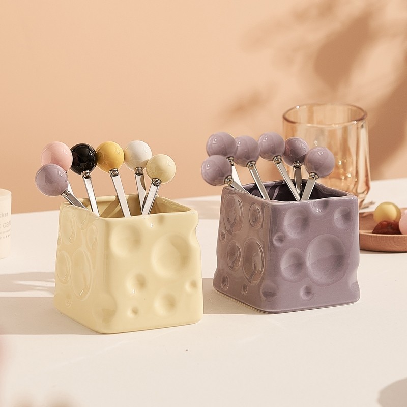 风创意水果叉子收纳罐陶瓷水果签家用套装高颜值勺子摆件食品级