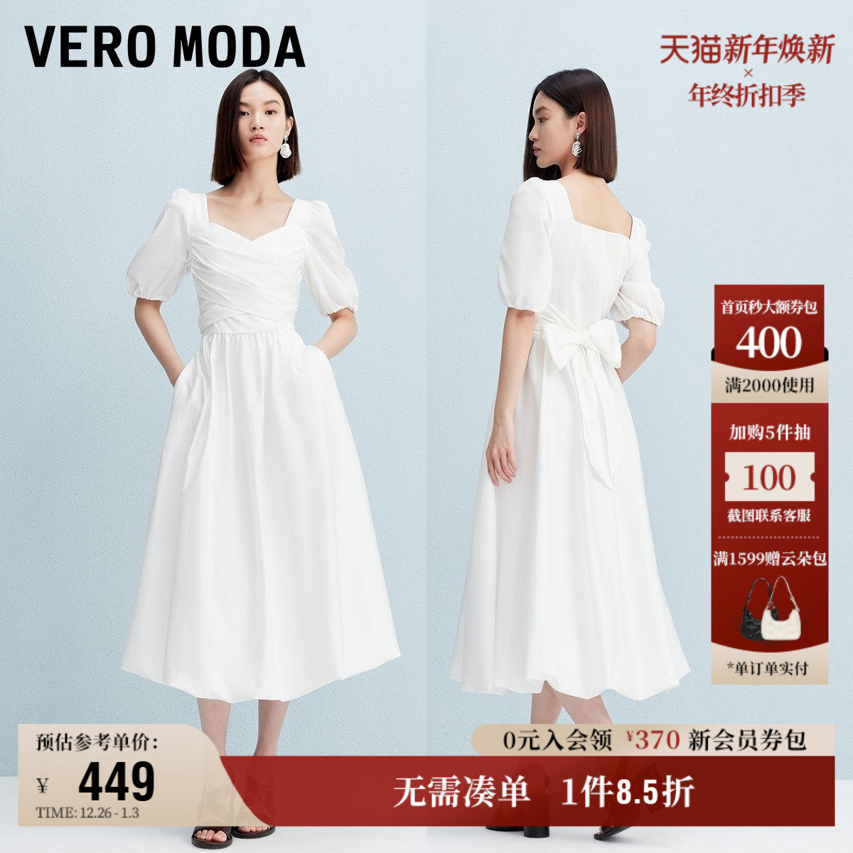 Vero Moda奥莱连衣裙女2025秋冬新款含棉交叉绑带捏褶长裙优雅