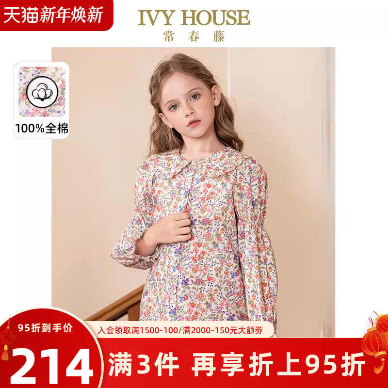 IVY HOUSE常春藤童装女童春夏新款 学院风娃娃领碎花长袖衬衫上衣