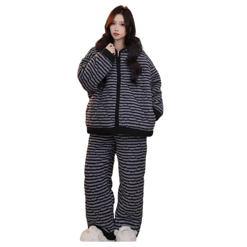 珊瑚绒睡衣女款冬季三层夹棉加厚加绒韩版条纹女士保暖冬天家居服