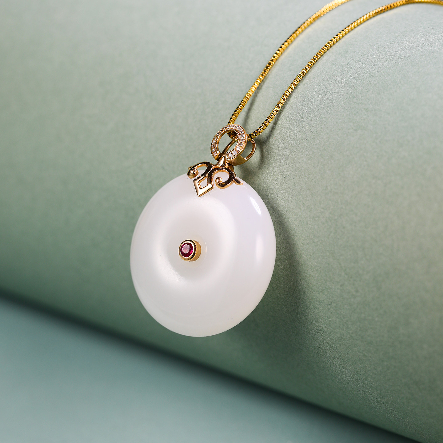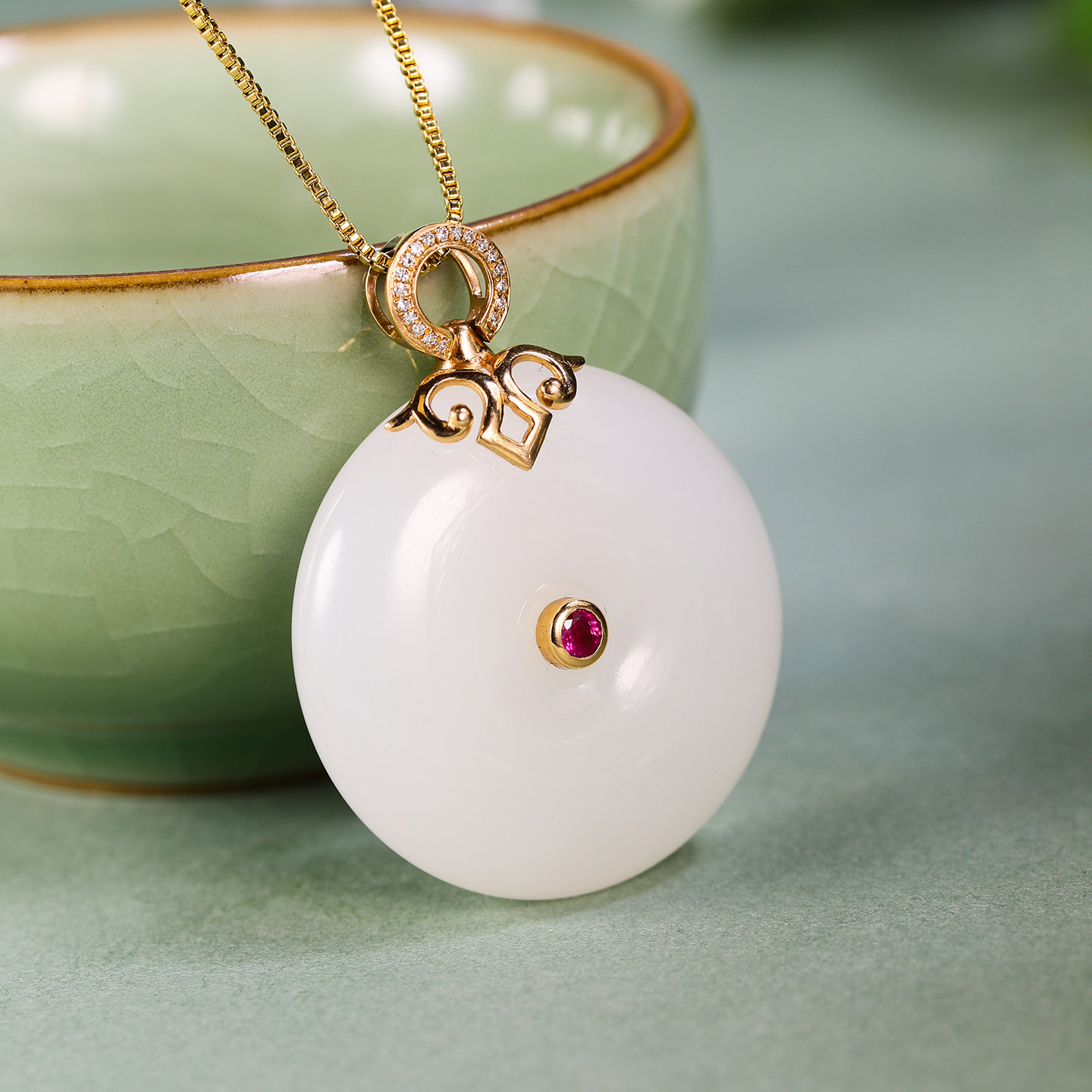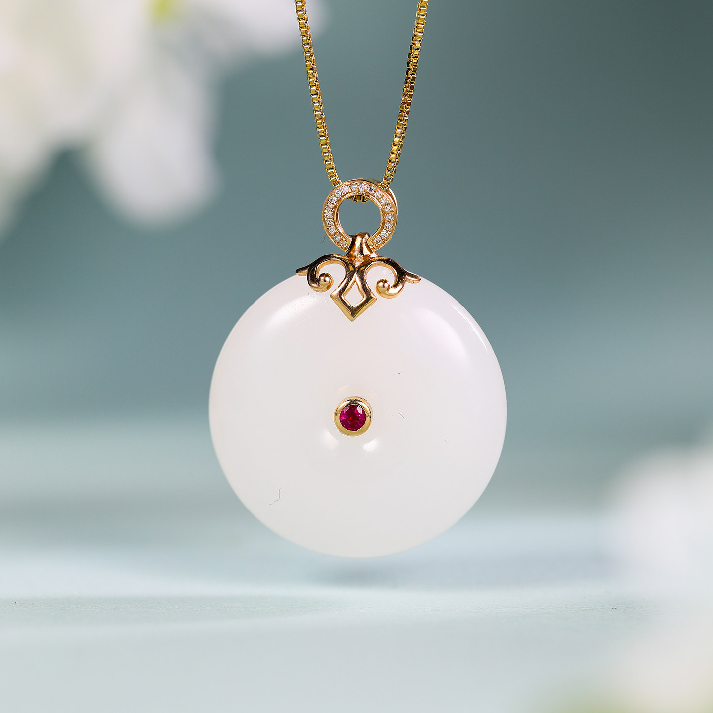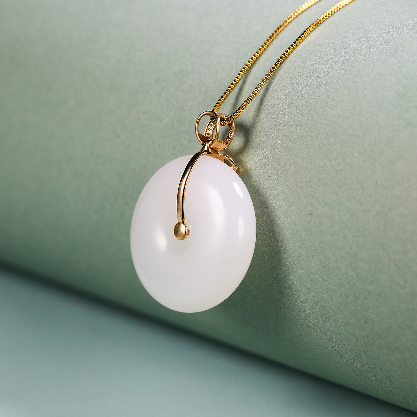 和合玉器和田玉羊脂白玉18k金镶玉平安扣挂件山料玉石吊坠颈饰女
