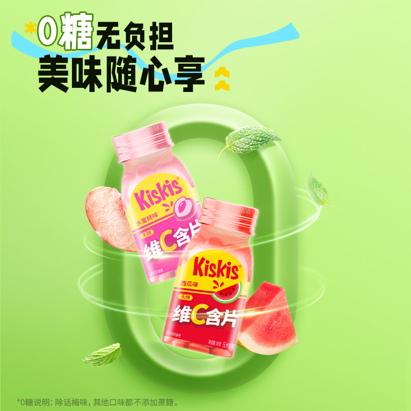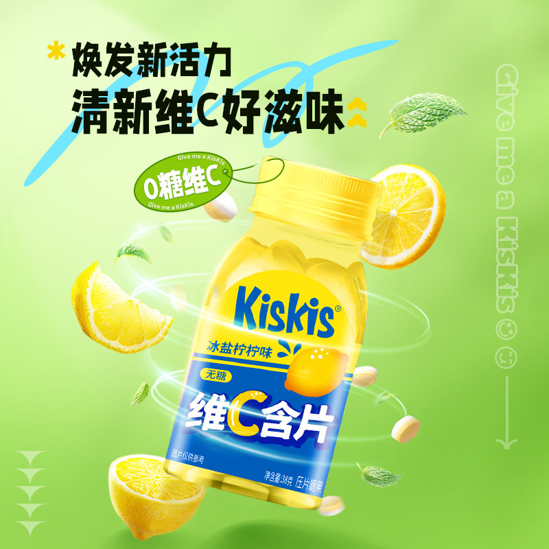 酷滋kiskis维c清口含片无糖薄荷糖果亲嘴口气清新零食2瓶装清凉