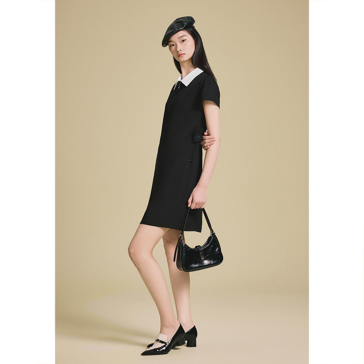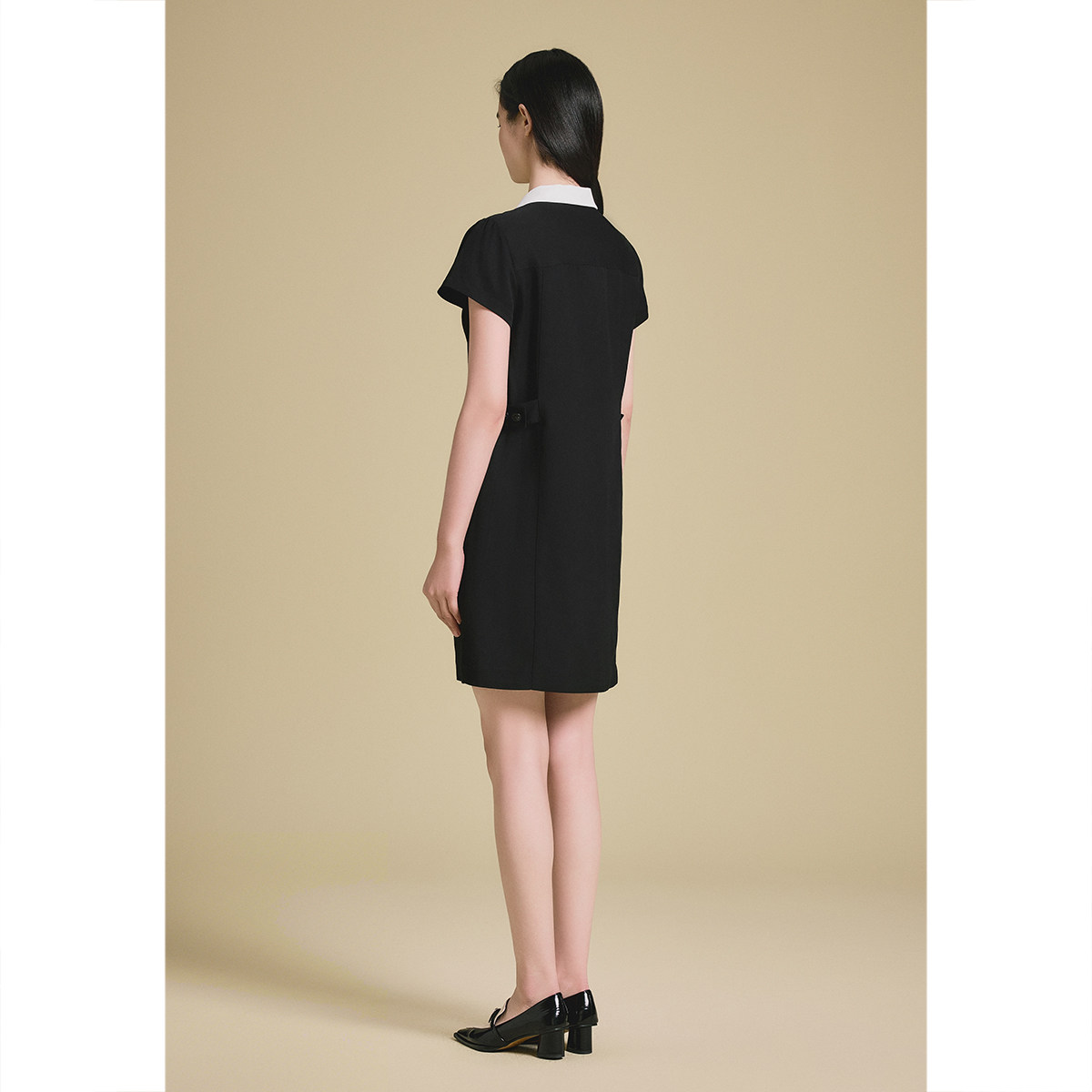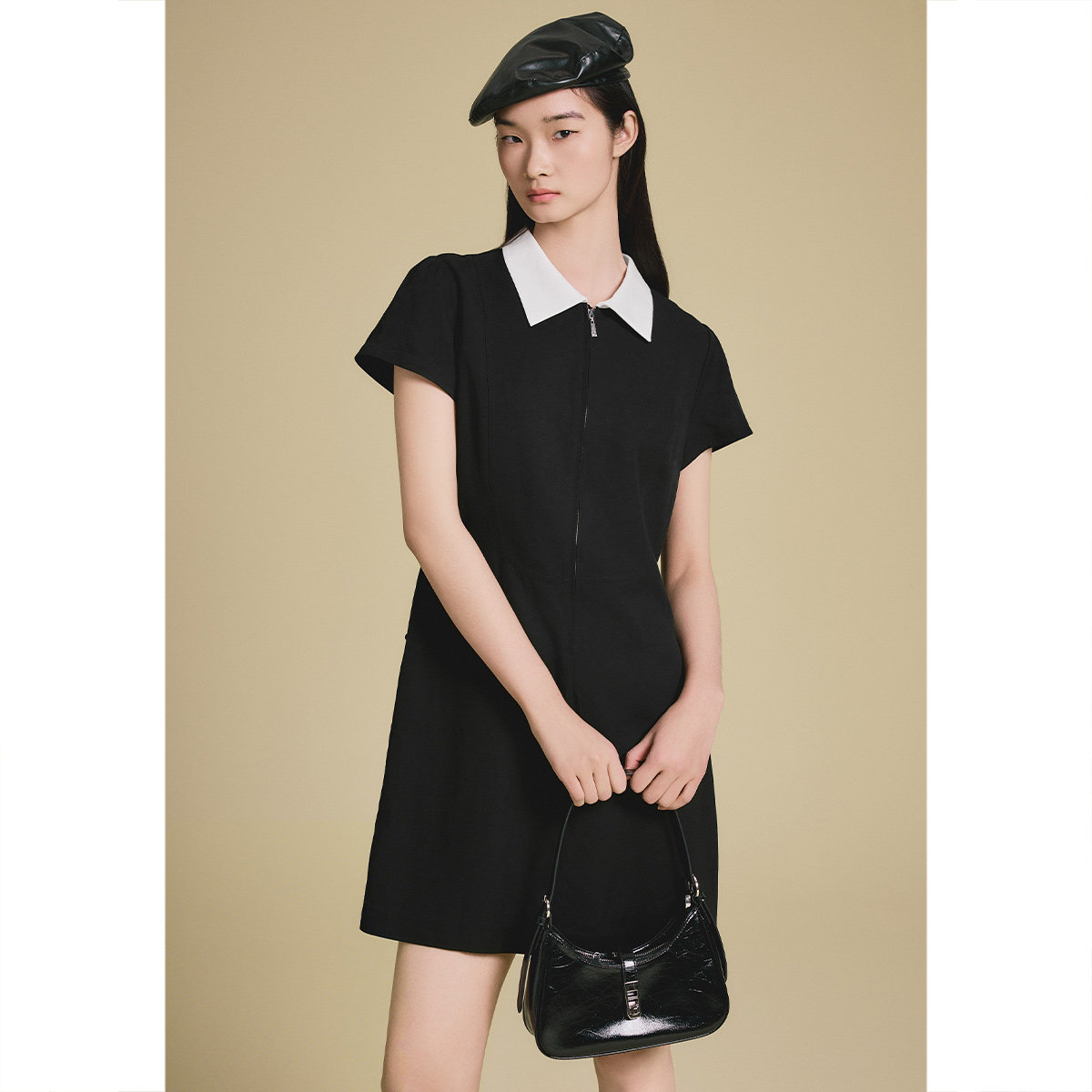 PSALTER诗篇学院风撞色翻领收腰显瘦连衣裙小黑裙2025夏款