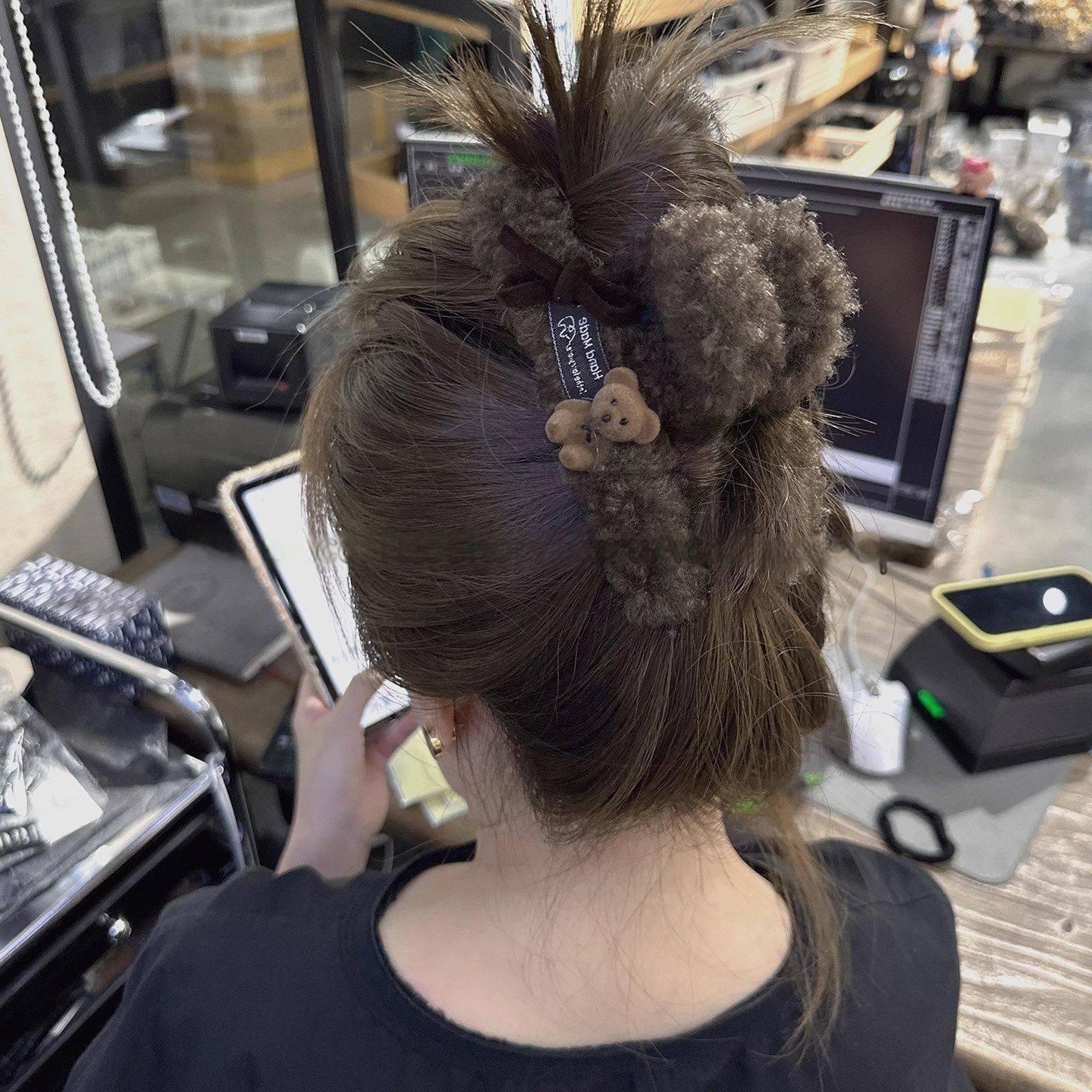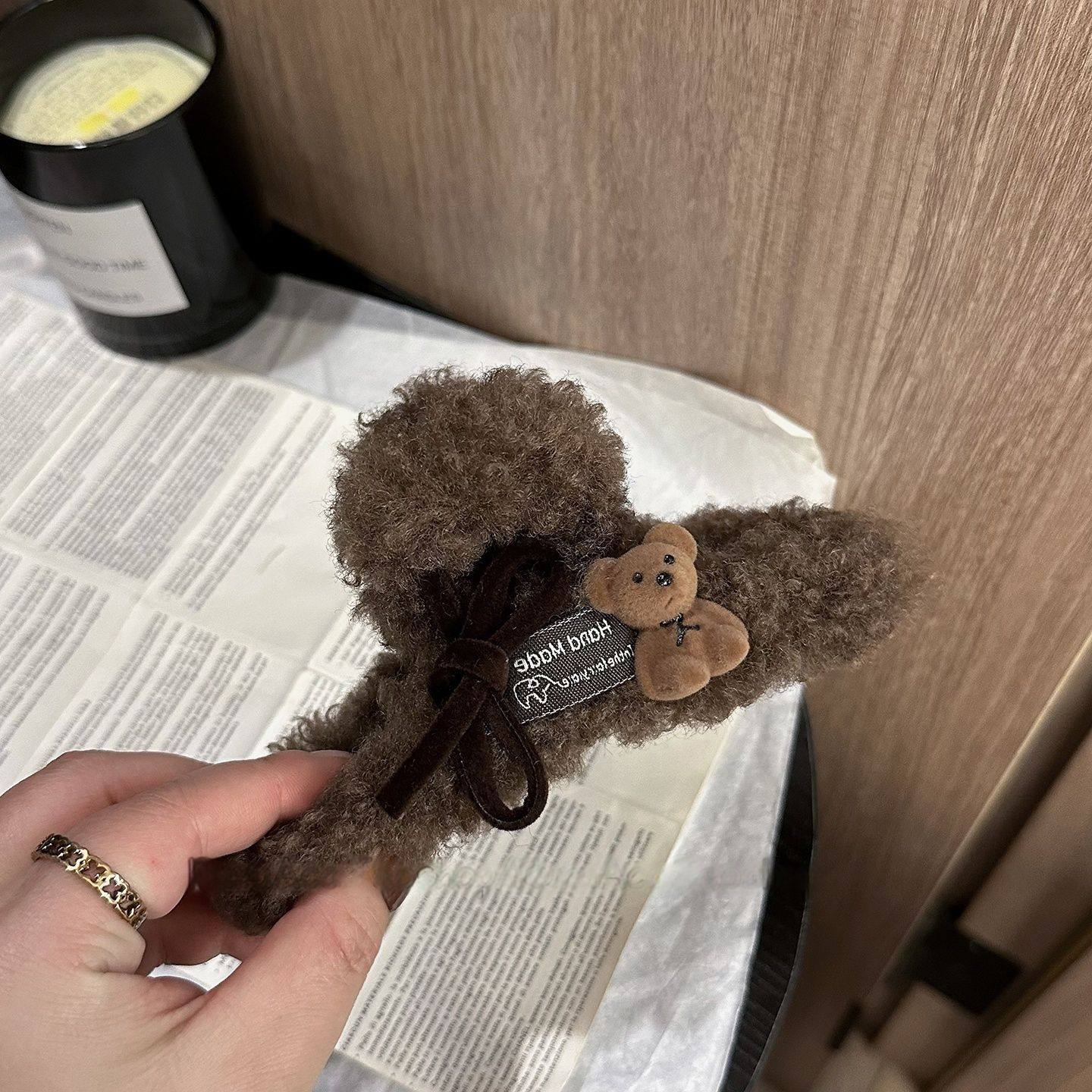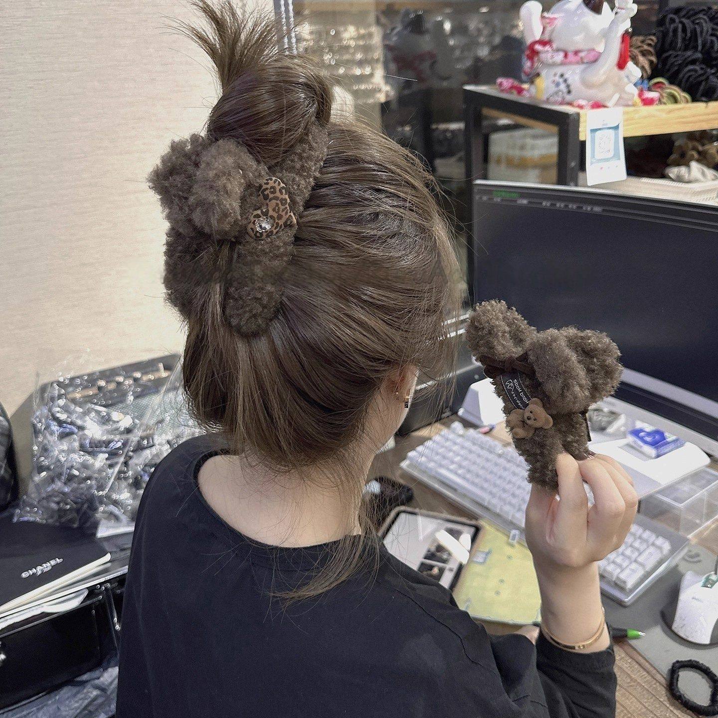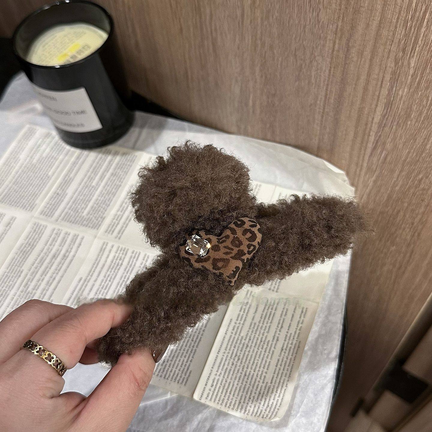 高级小众咖色豹纹爱心小熊毛绒抓夹大号后脑勺发夹韩国新款鲨鱼夹