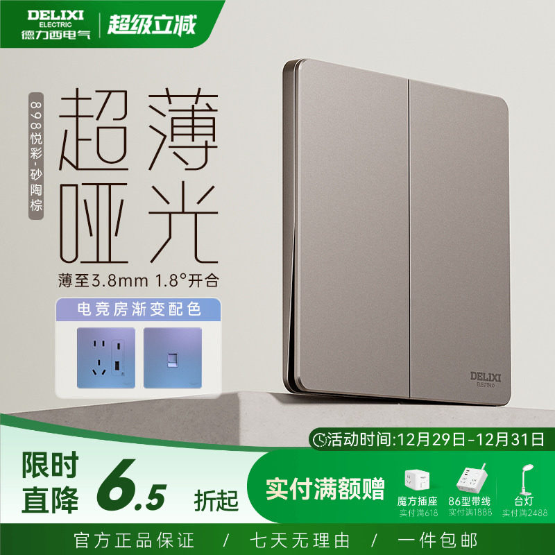 德力西超薄开关插座奶油风五孔面板86型16a家用暗装898PC砂陶棕