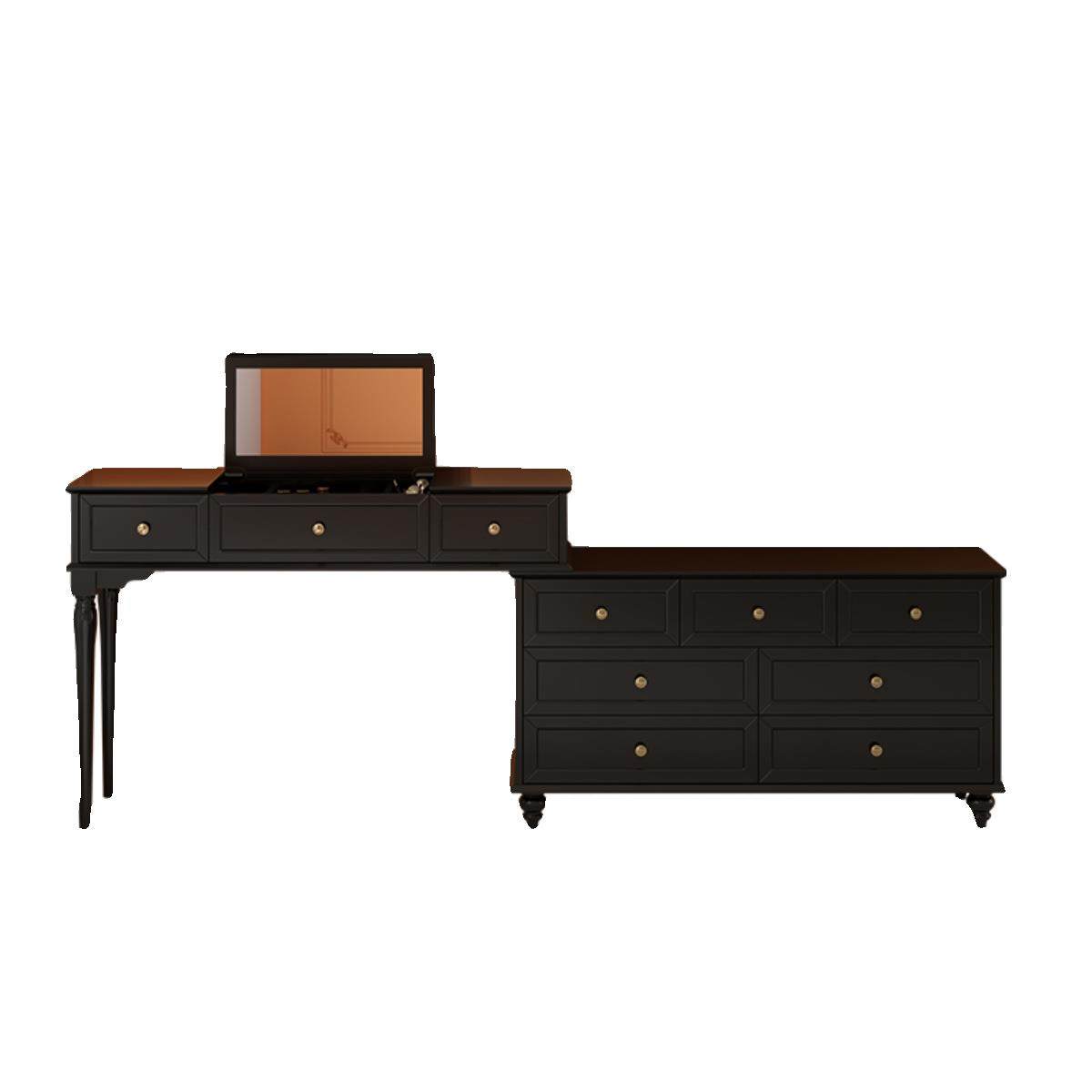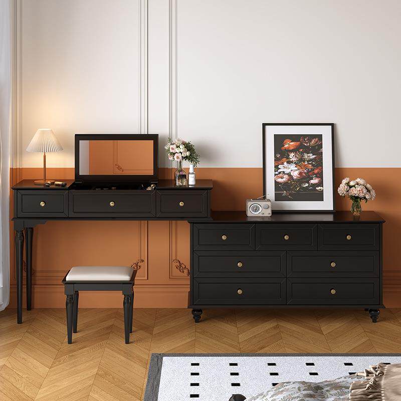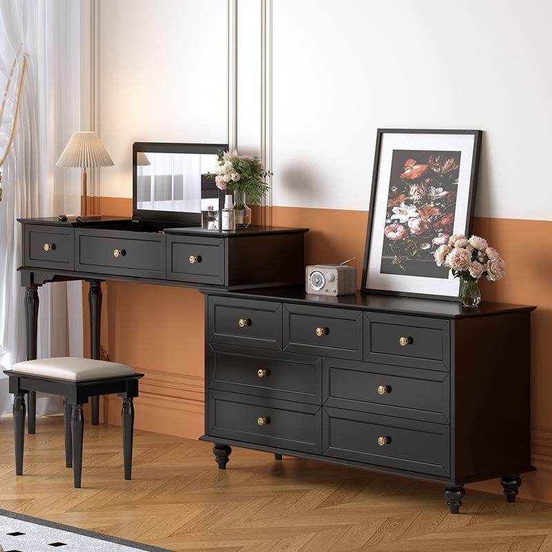 美式实木复古主卧床尾斗柜妆台一体中古风卧室黑色翻盖梳妆台镜子