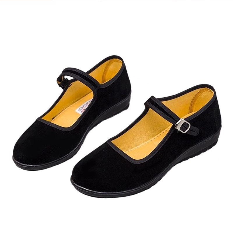 老北京布鞋女舒适一字带工作鞋平底奶奶鞋妈妈鞋黑色软底广场舞鞋