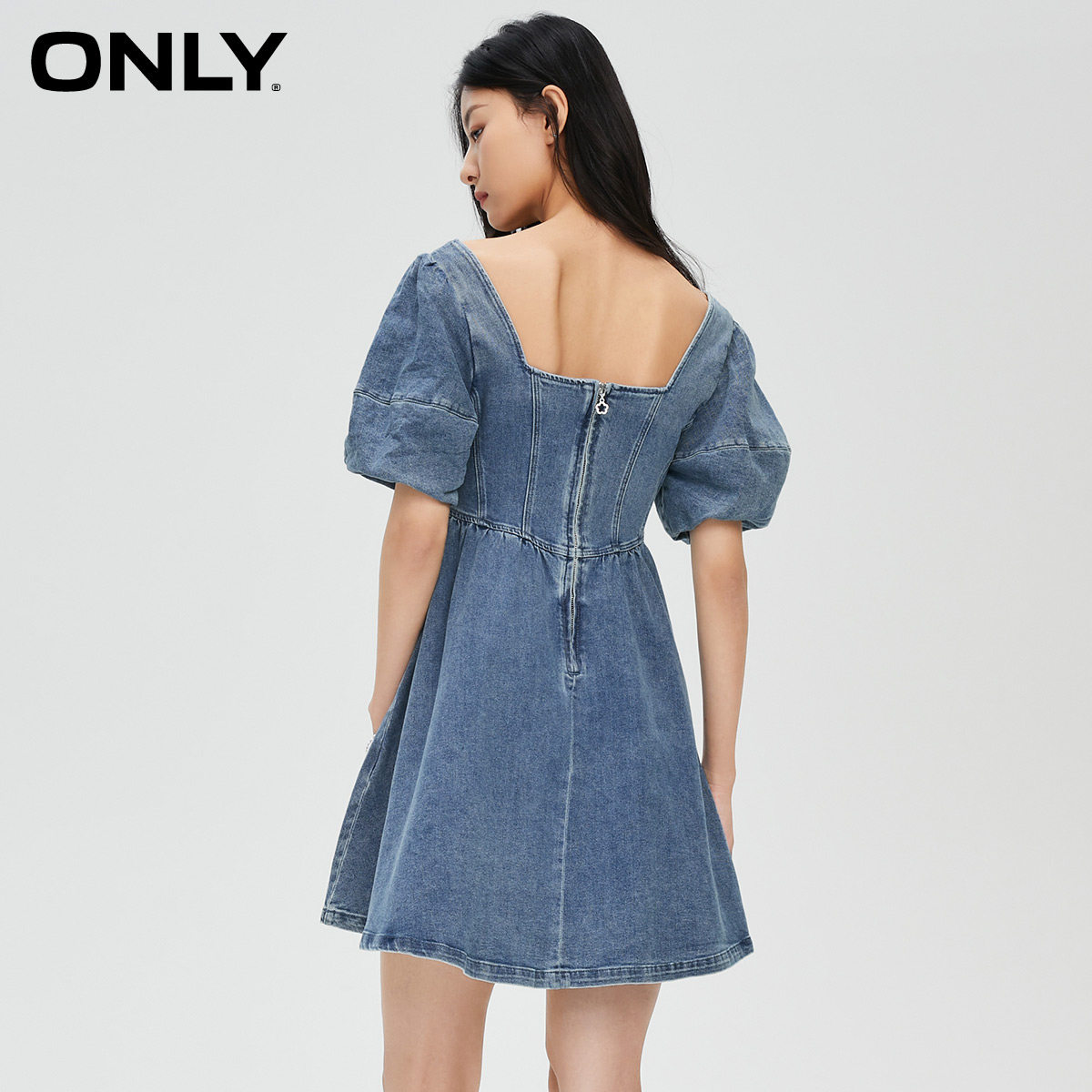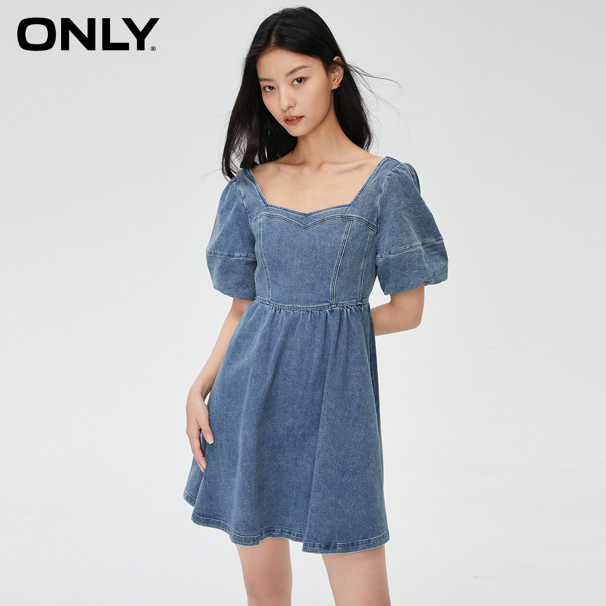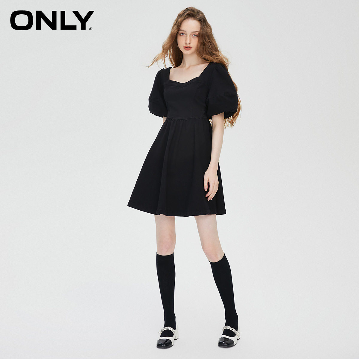 【ONLY奥莱】春季新款时尚潮流方领泡泡袖A字短款连衣裙女