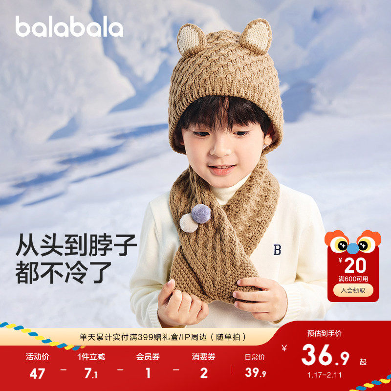 巴拉巴拉儿童帽子围巾一体男童女童保暖厚实舒适温暖冬季萌趣可爱
