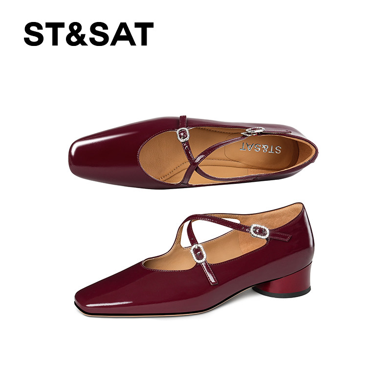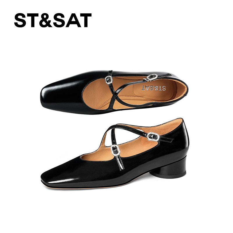 真皮~骄屿法式玛丽珍高跟鞋春秋水钻方头漆皮气质粗跟单鞋不累脚