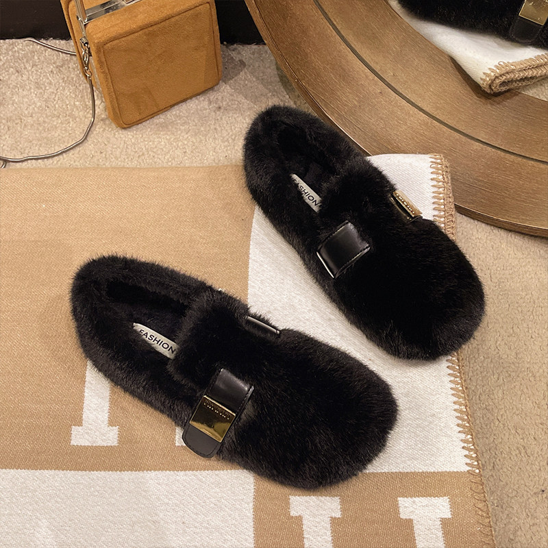 羊皮版复古玛丽珍鞋女方头秋冬季加绒保暖毛毛棉鞋平底晚晚单鞋女