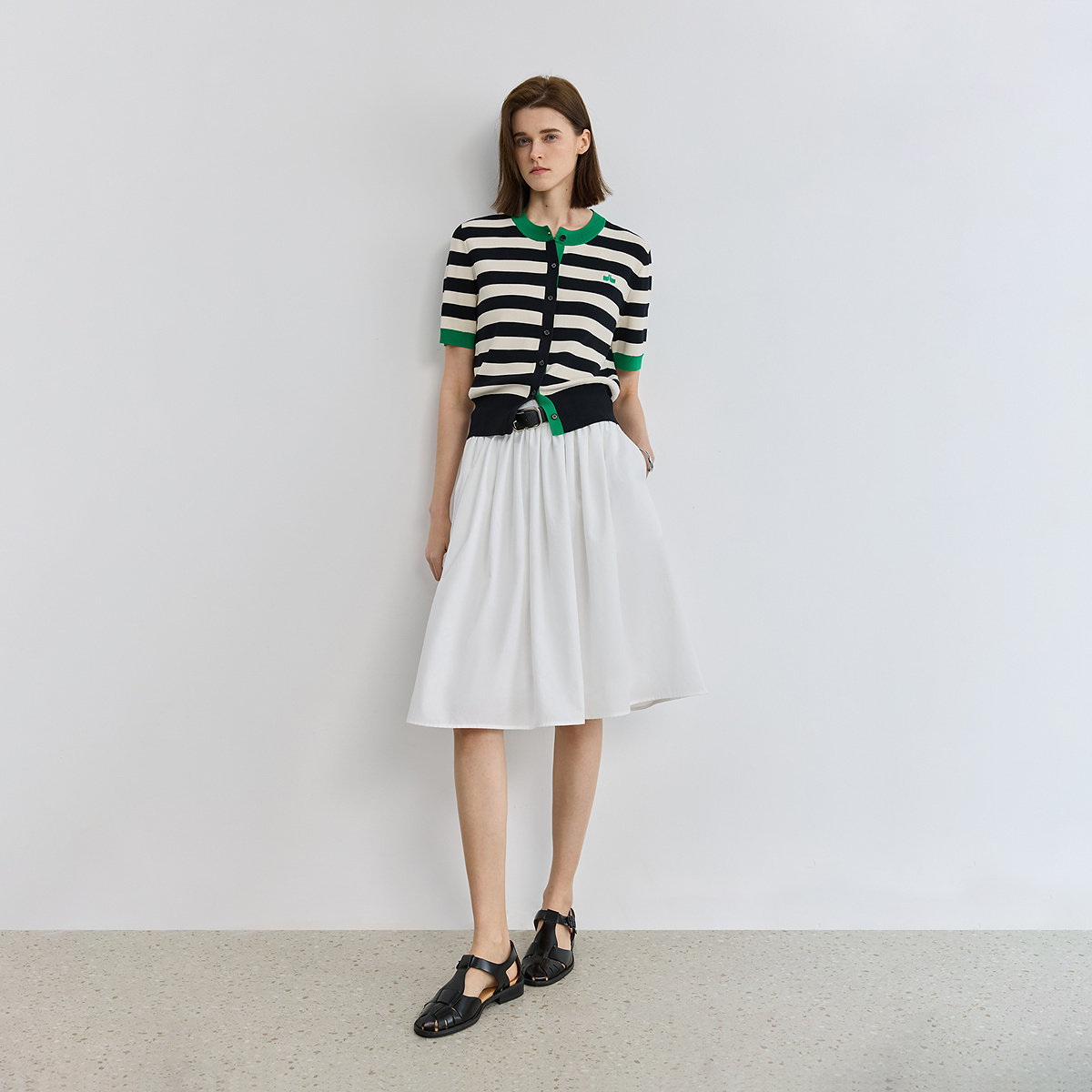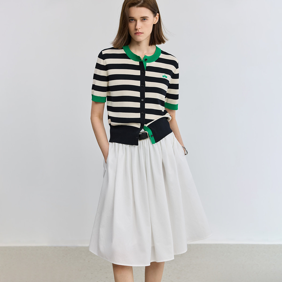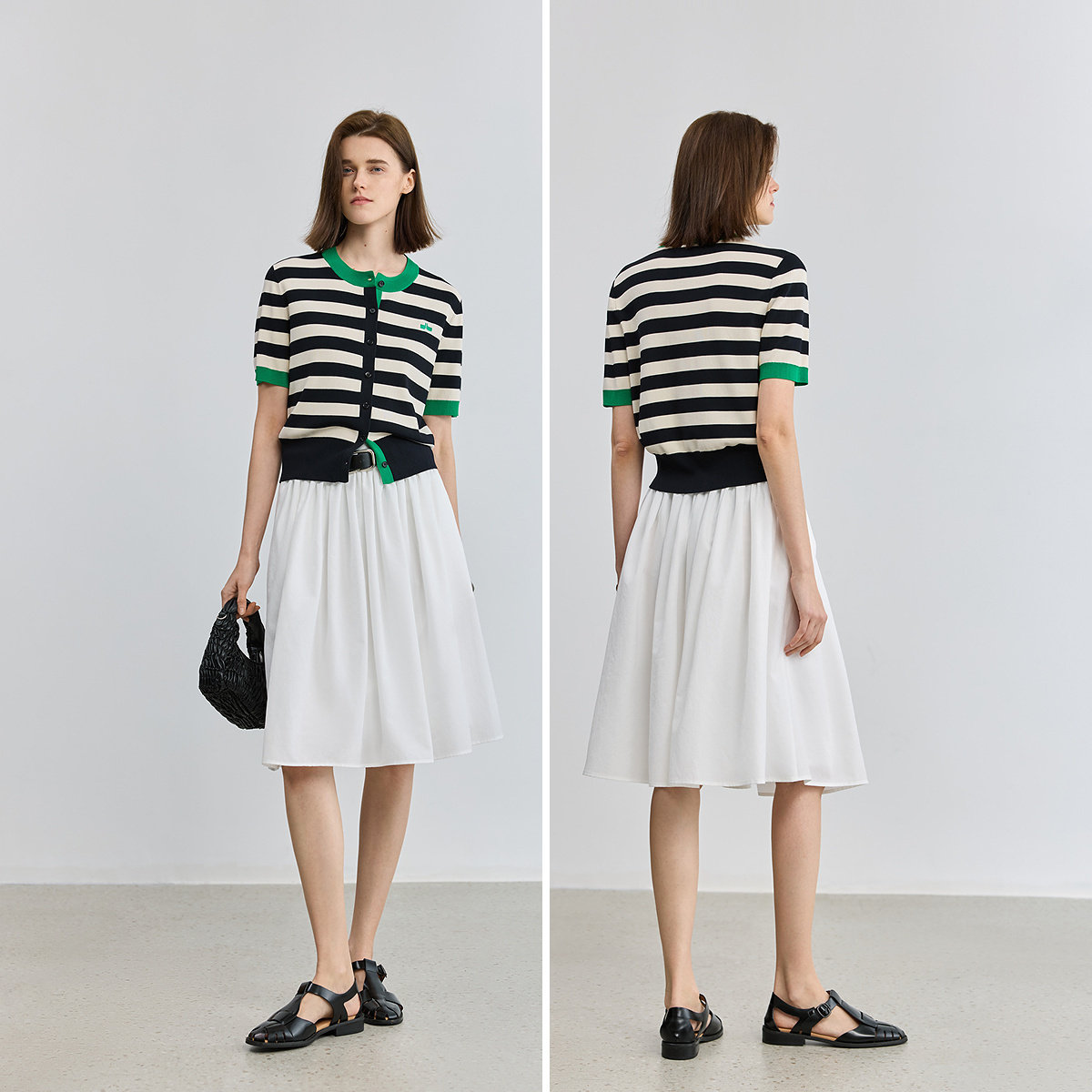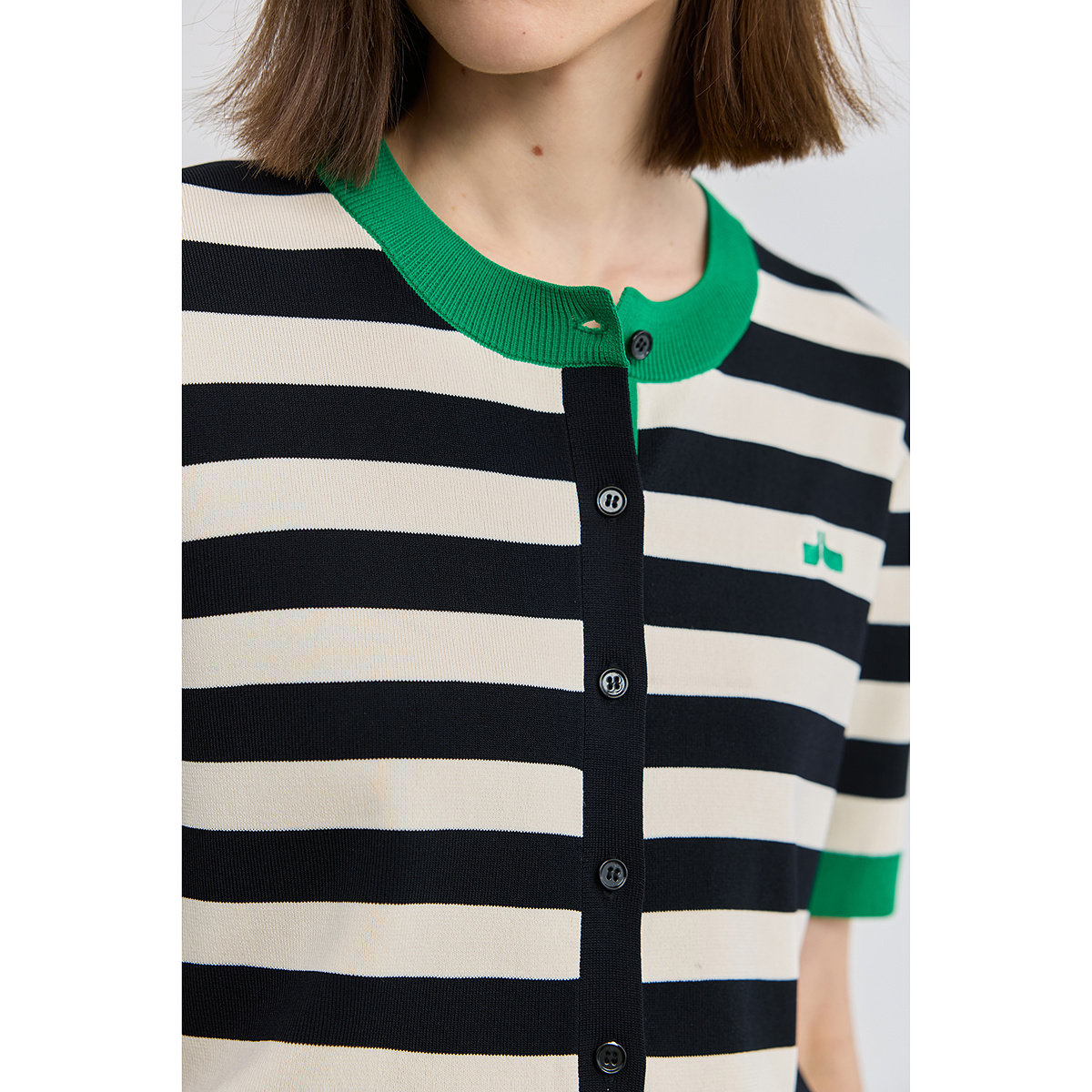 LILY2026夏新款女装设计感复古黑白撞色条纹圆领短袖针织开衫外套