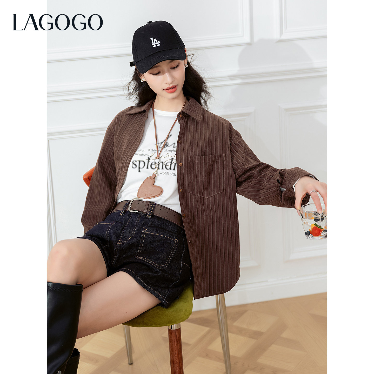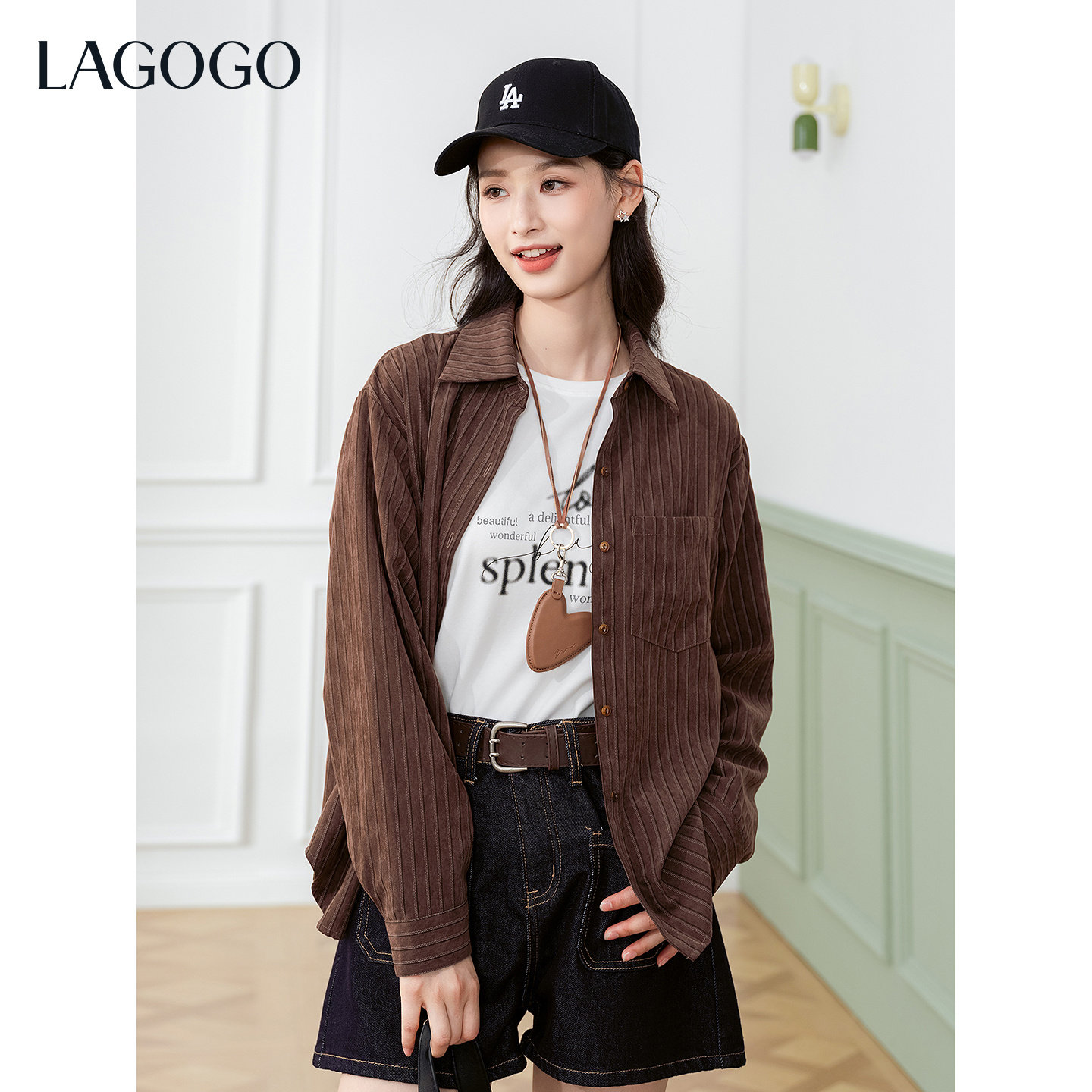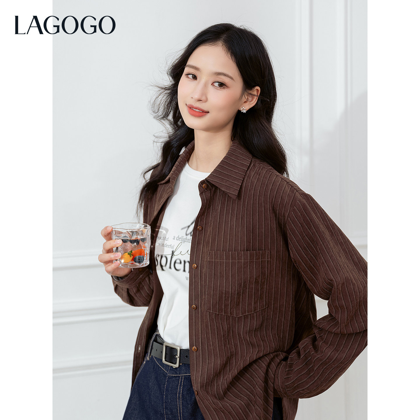 LAGOGO琥珀流光桃皮绒衬衫女拉谷谷2026年春新款长袖宽松薄外套