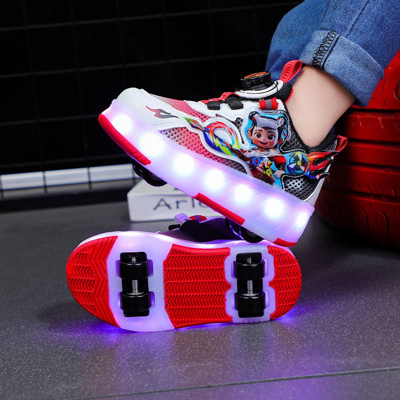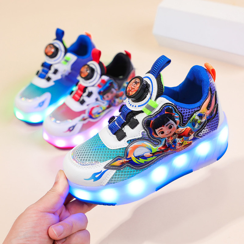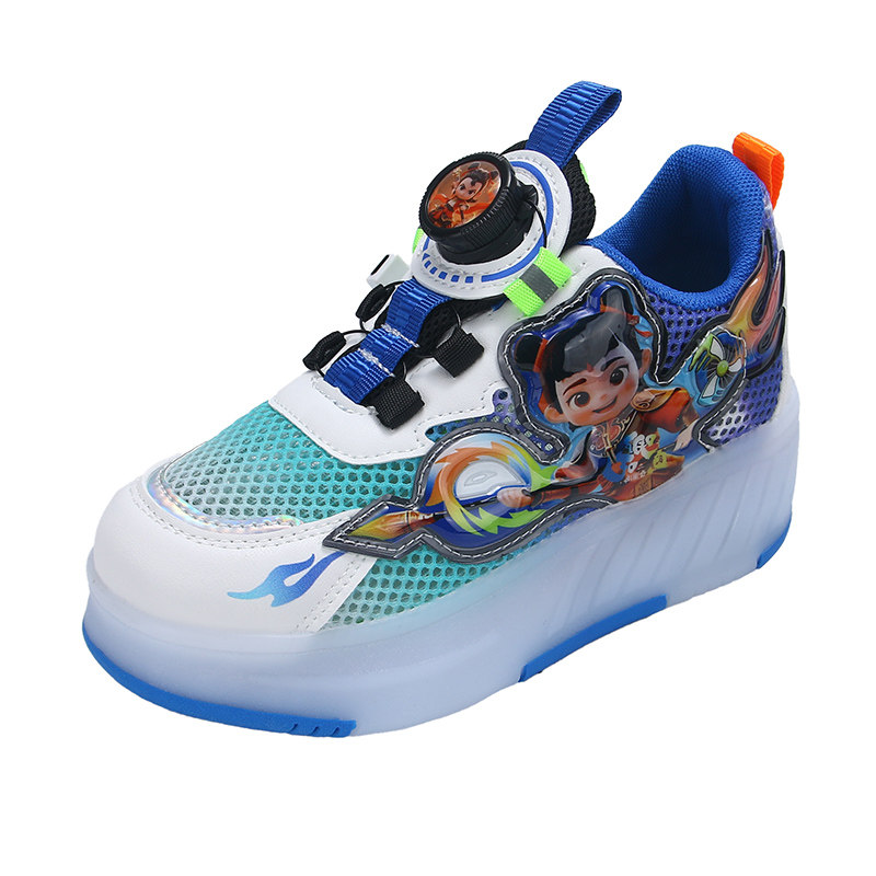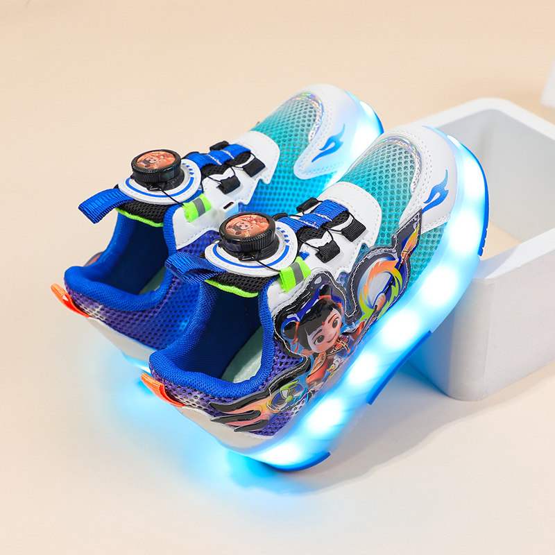 2025新款夏季儿童暴走鞋男童发光运动滑轮鞋男孩四轮鞋子纽扣网面