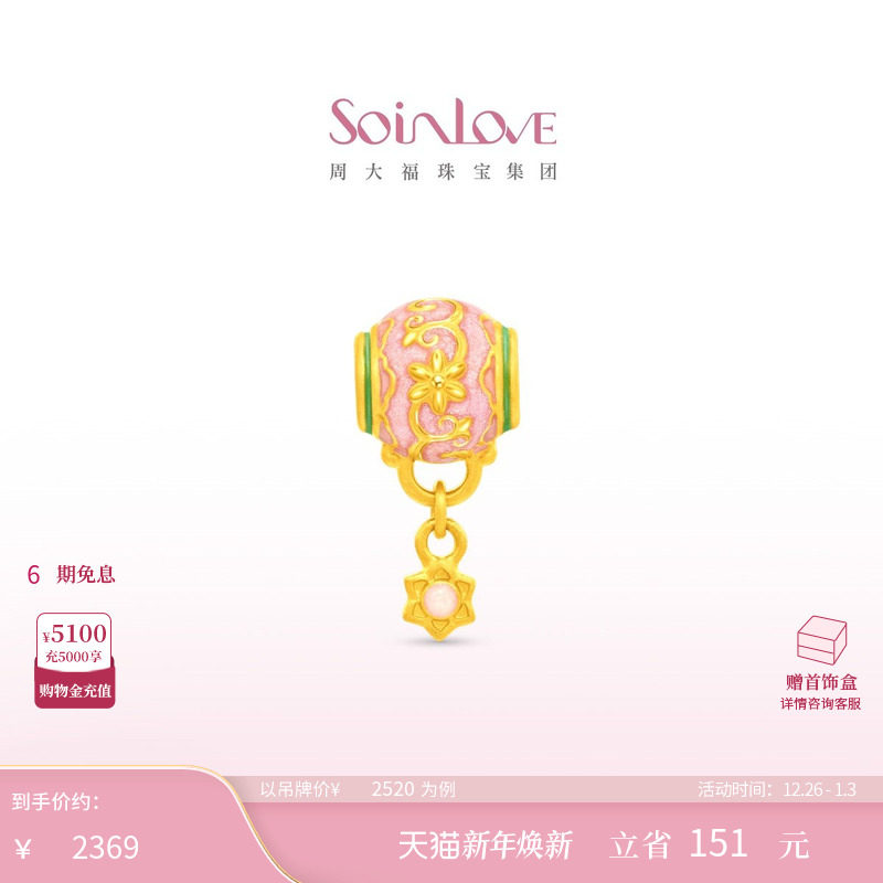 周大福SOINLOVE蜜粉金十里红妆粉彩宝相黄金转运珠配绳生日礼物