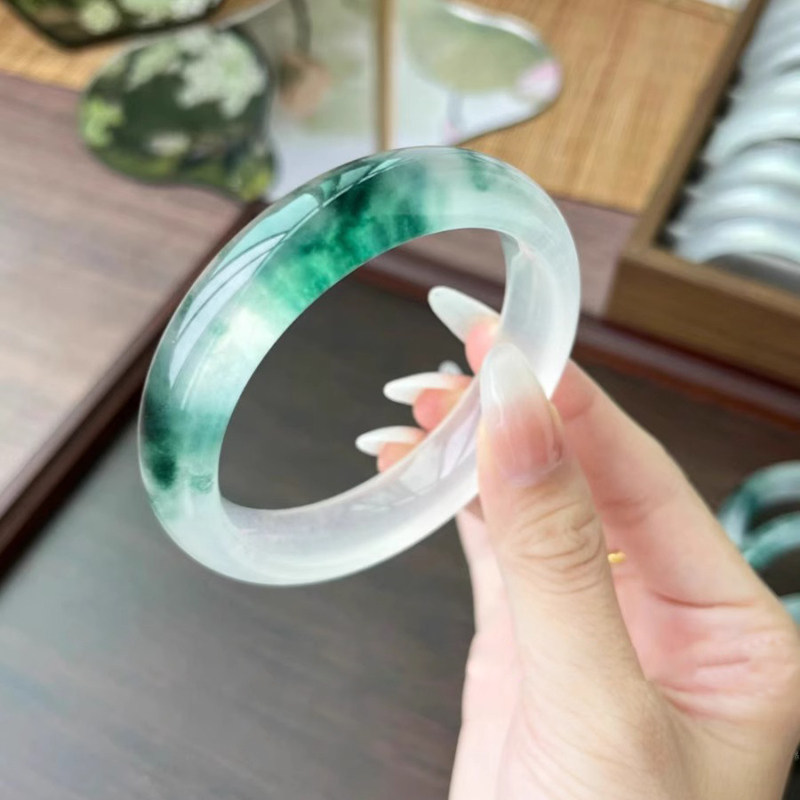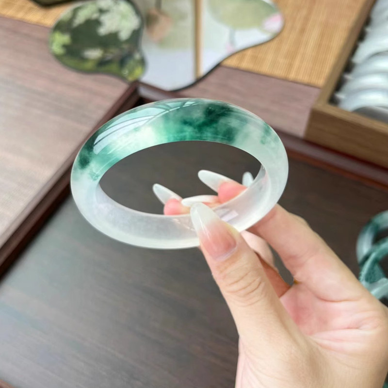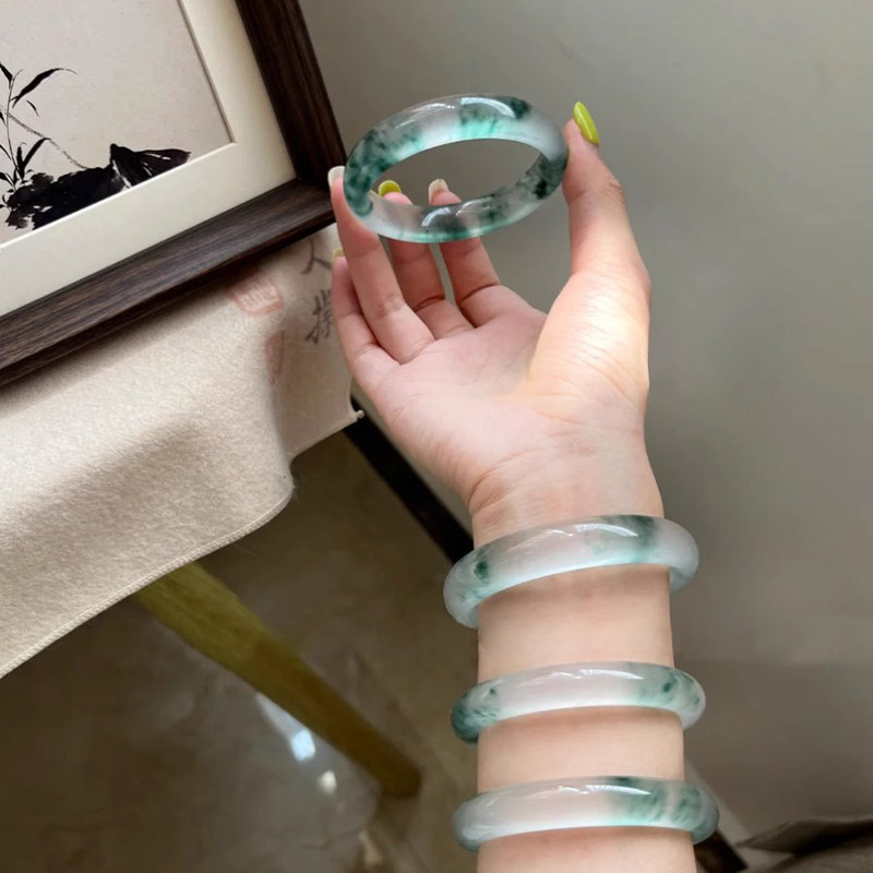 冰种冰透飘花玉镯子石英岩高冰手镯翡翠色女款扁镯独龙玉平替正品