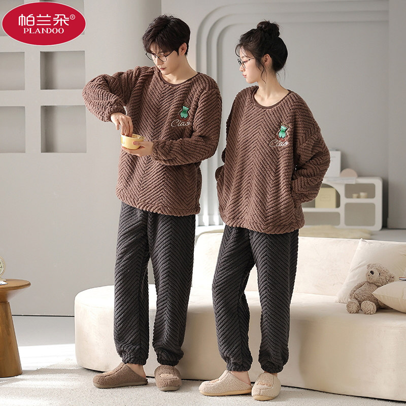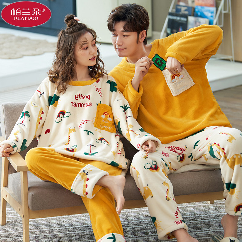 帕兰朵情侣款睡衣女款秋冬季保暖珊瑚绒冬天男士法兰绒家居服套装