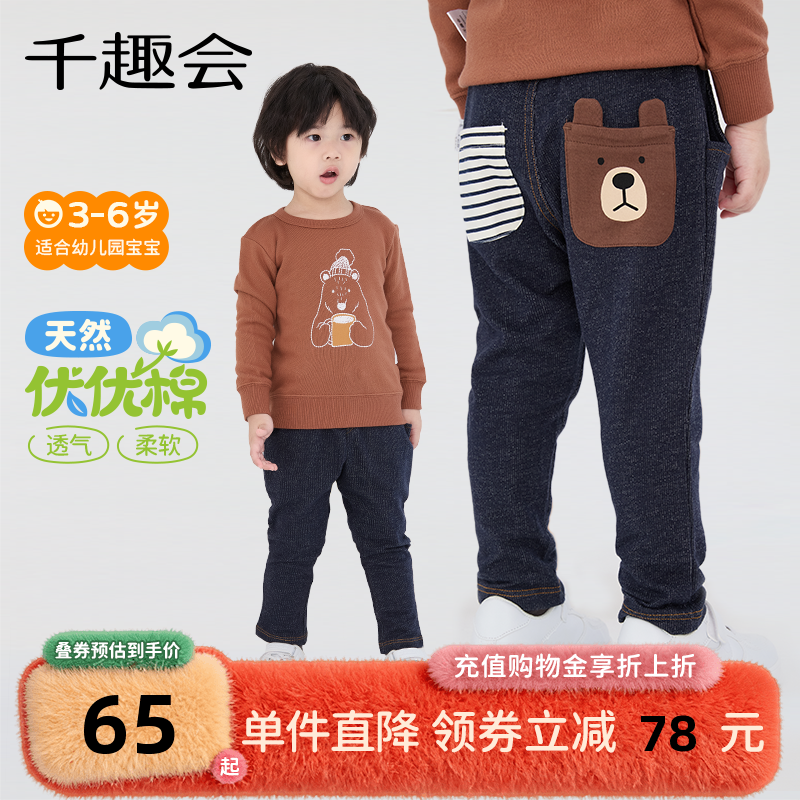 [骏马福裳520G]齐齐熊宝宝裤子加绒加厚冬款男童牛仔裤保暖裤新年