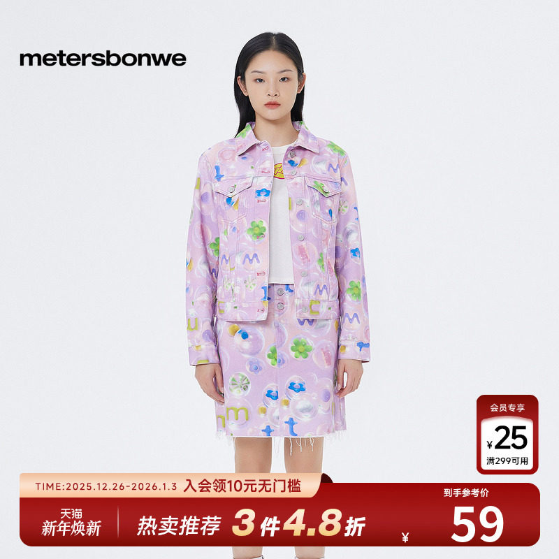 美特斯邦威全棉时尚外套女甜美印花牛仔上衣春秋翻领气质百搭夹克