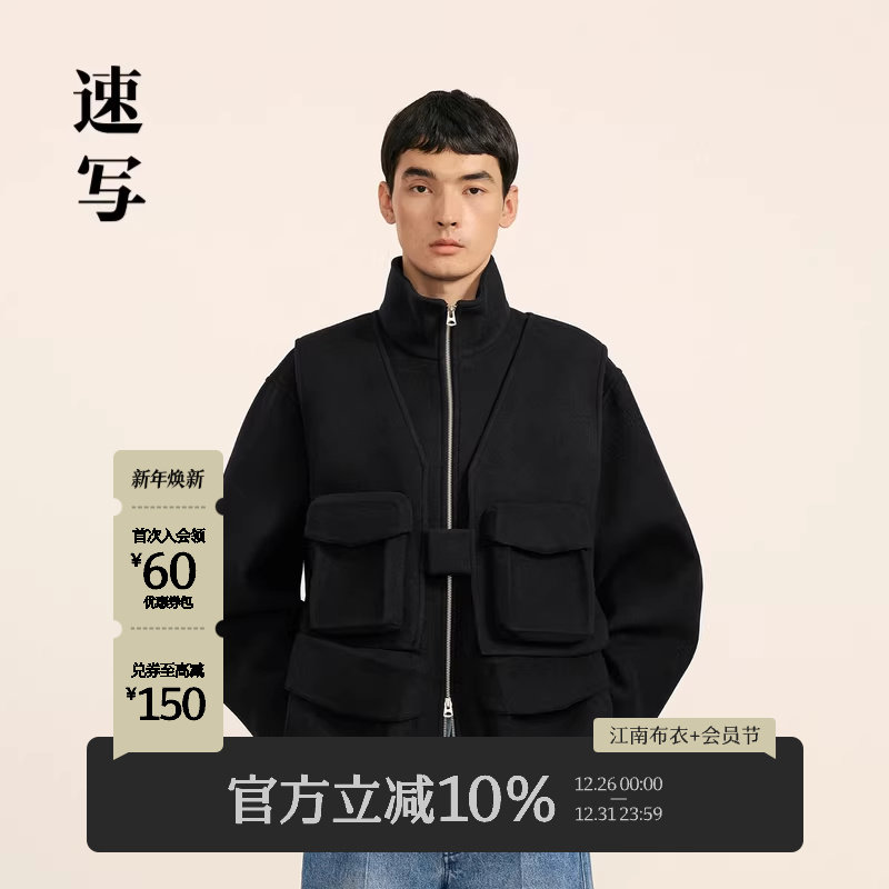 速写男装秋冬新款短款毛呢外套休闲宽松可拆卸设计感外套潮保暖