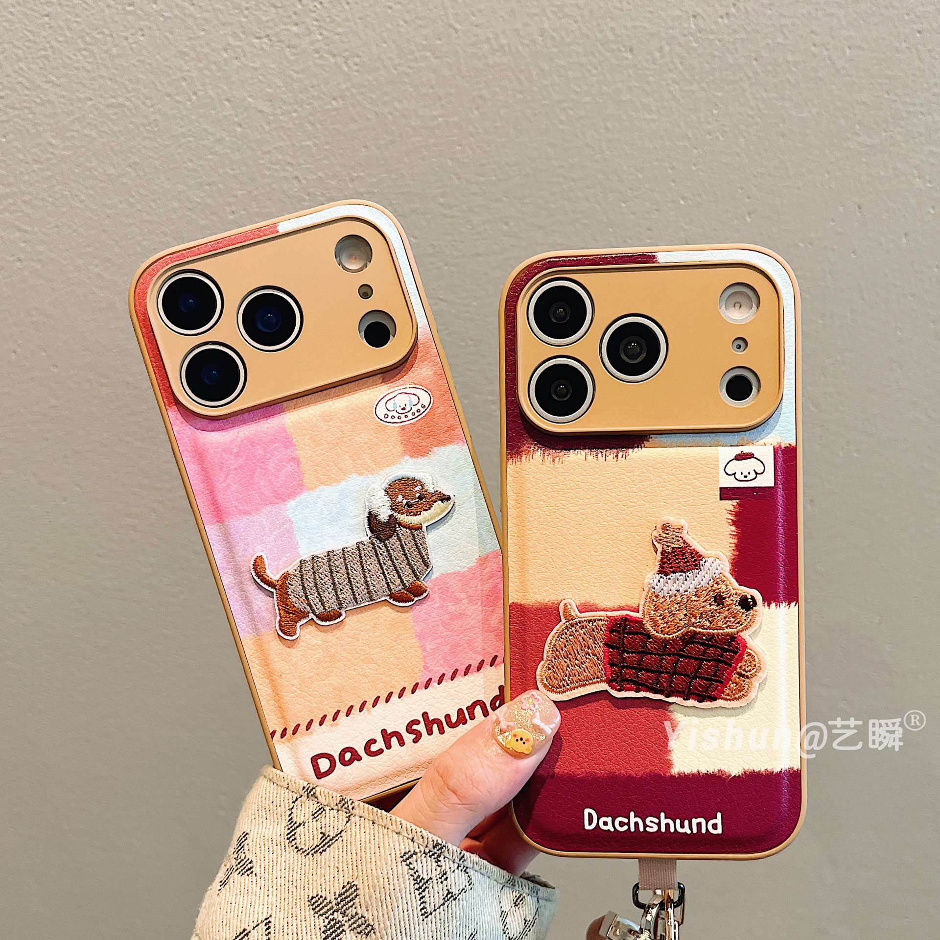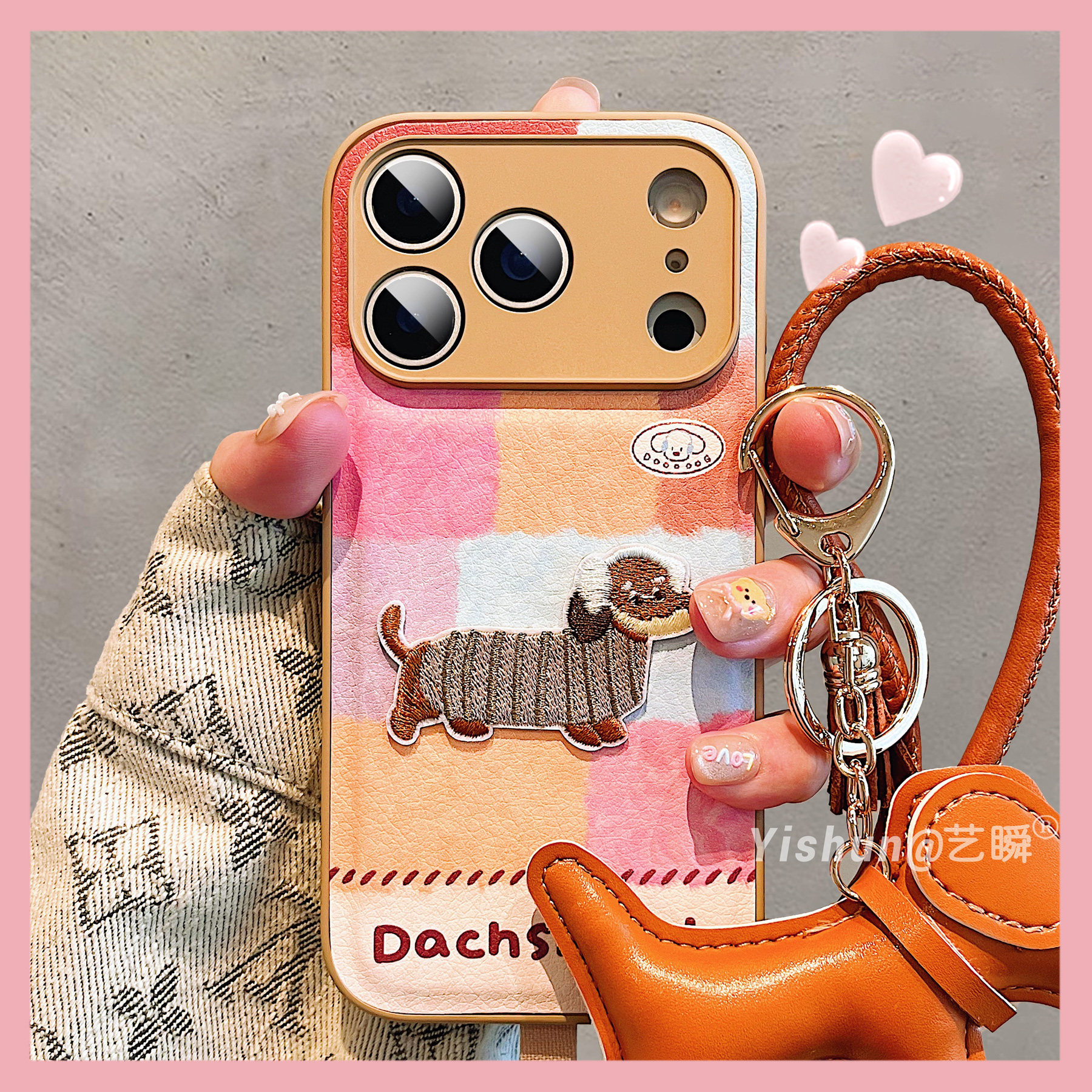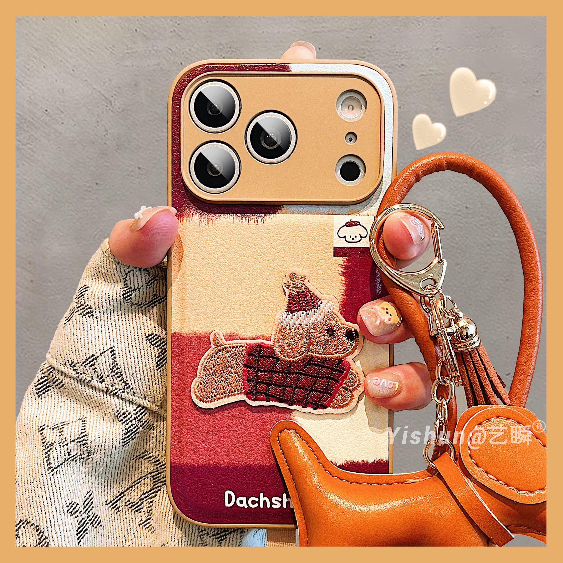 秋冬新款韩系卡通拼接刺绣狗狗适用iPhone17ProMax手机壳苹果16pro皮质鼓包14创意13硅胶软边15pro新款保护套