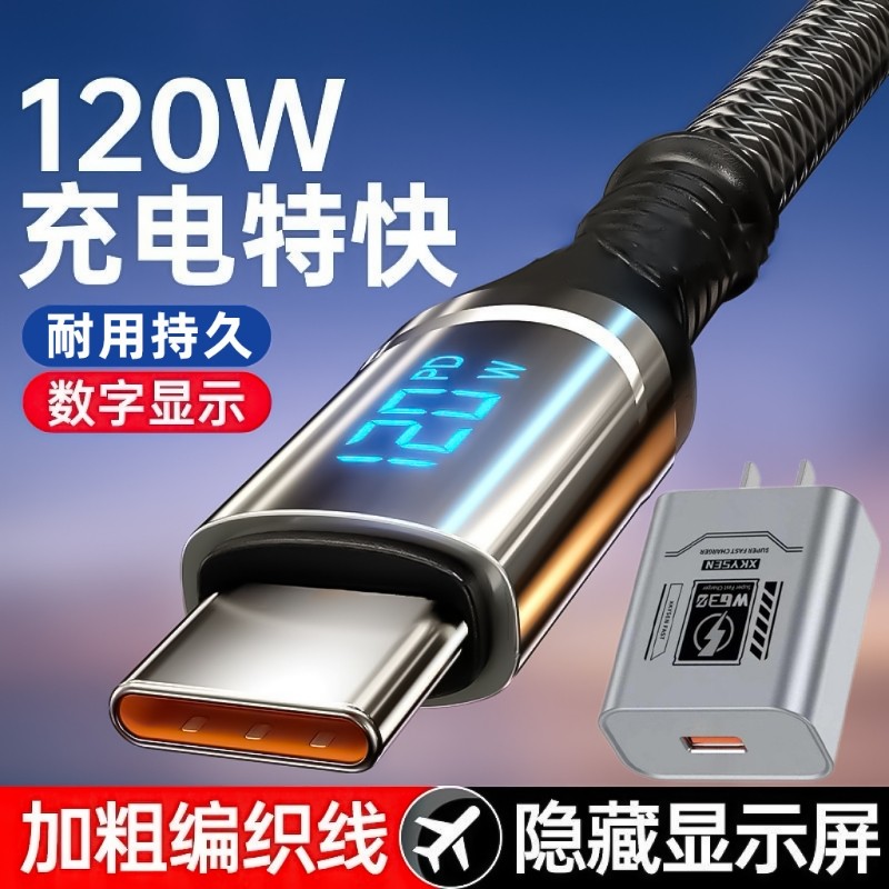 120W超级快充数据线Type-C智能断电数字显示适用华为荣耀小米OPPO闪充vivo手机充电线