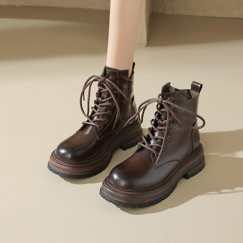真皮版~棕色马丁靴女2025秋冬新款厚底增高短靴小个子英伦风靴子