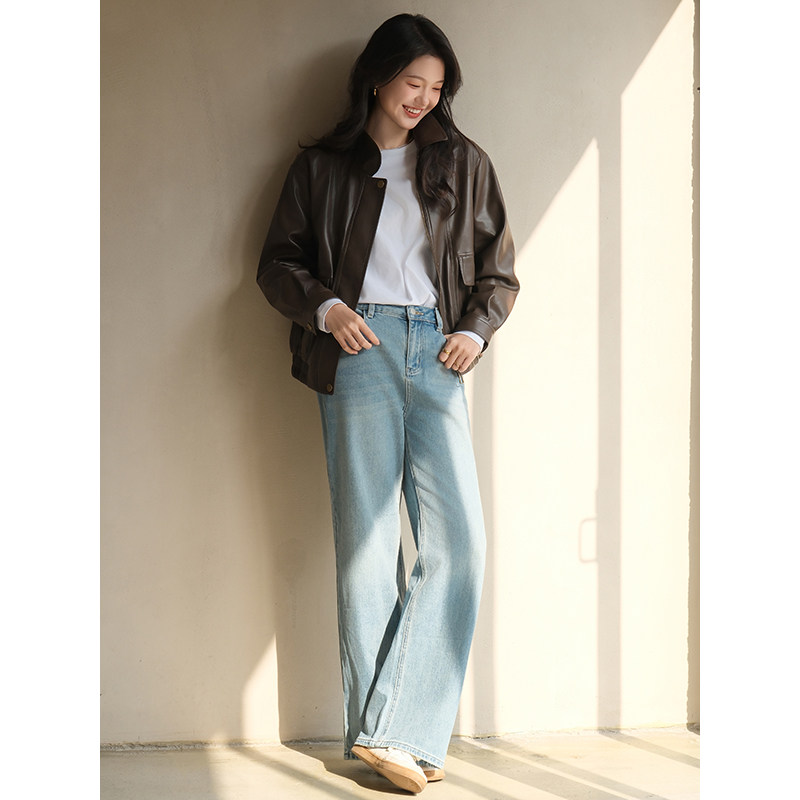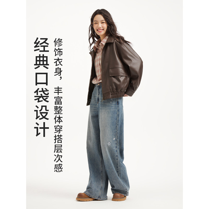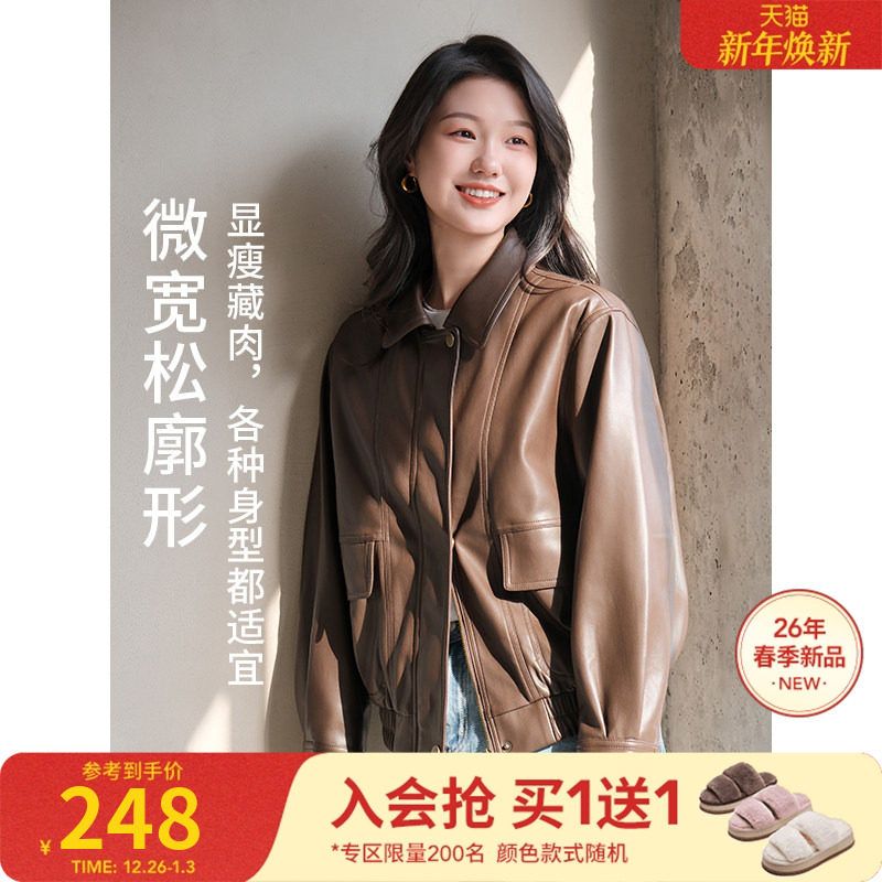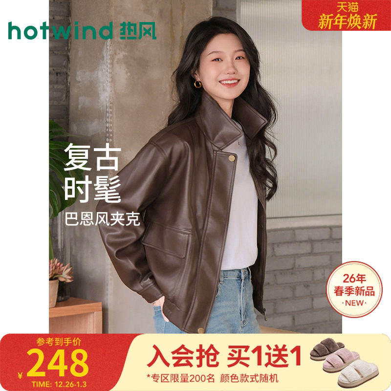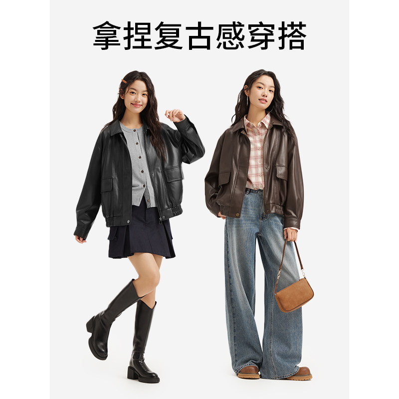 热风2026年春季新款女士复古PU外套甜酷机车风夹克柔软耐穿