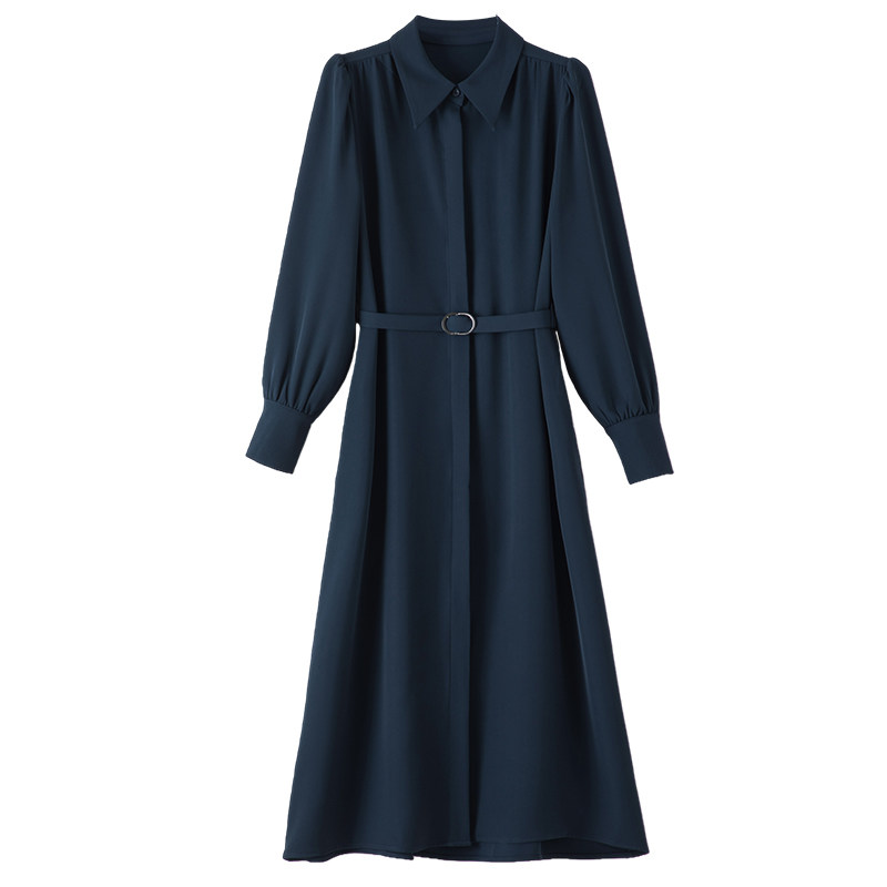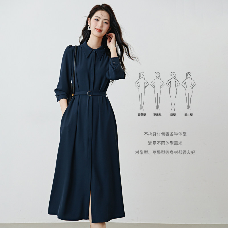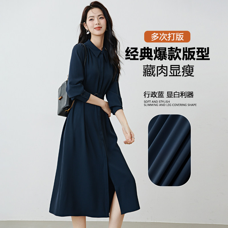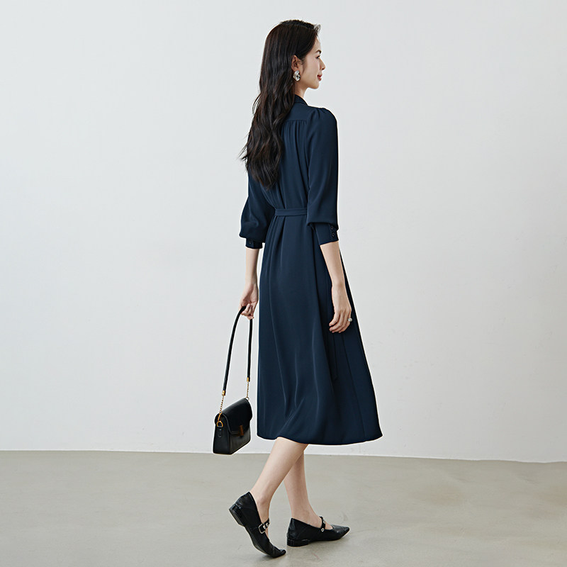 晚白2026年春新款翻领正式场合衬衫裙系带收腰行政蓝通勤连衣裙