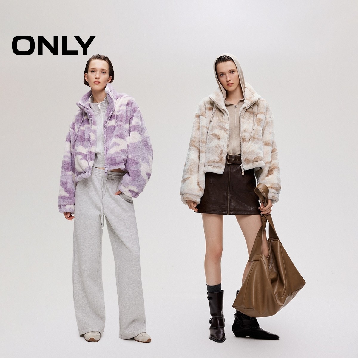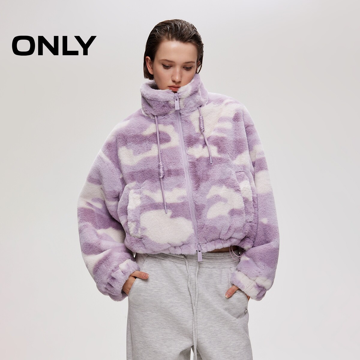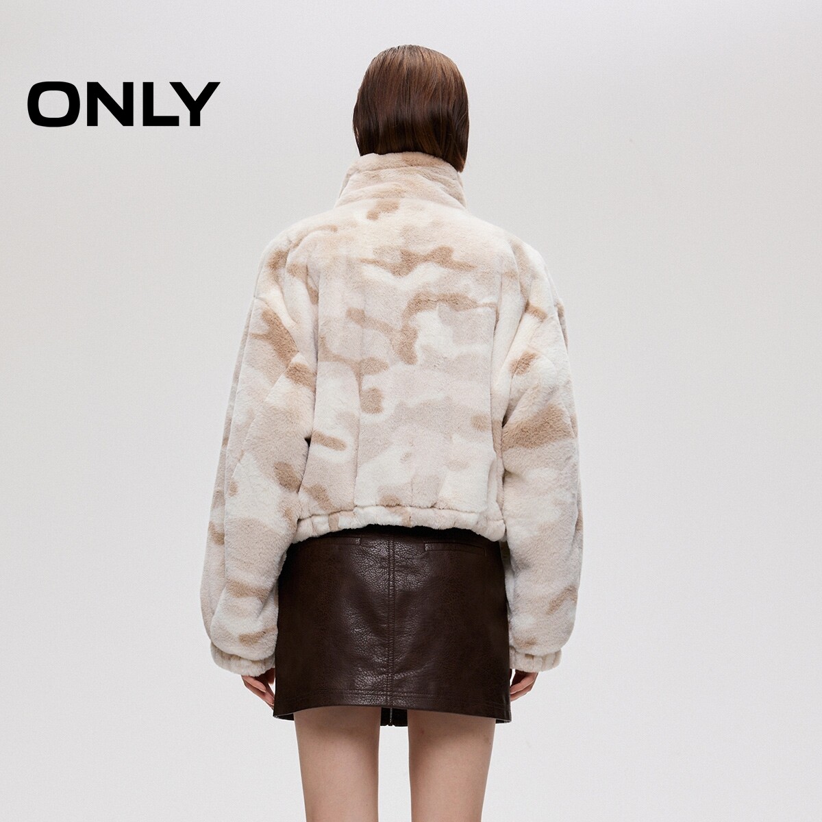 【ONLY奥莱】春季可调节抽绳下摆个性迷彩宽松短款毛绒棉服外套女