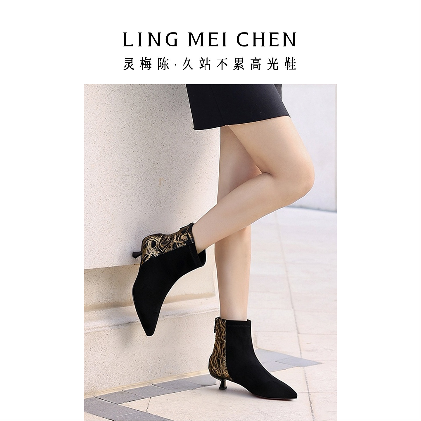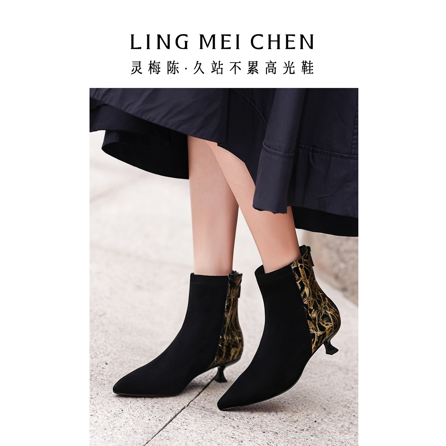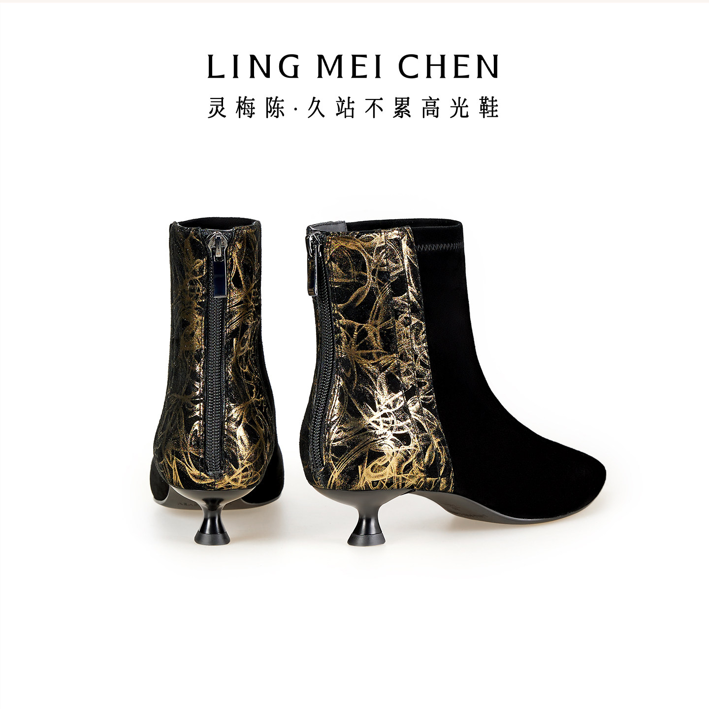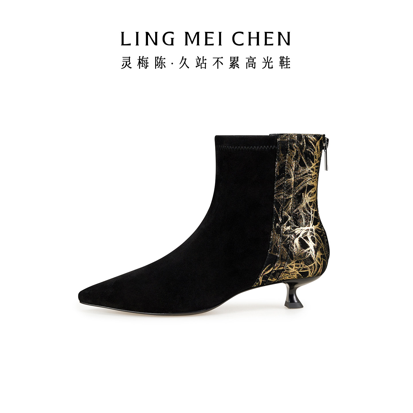 LINGMEICHEN小猫跟短靴尖头高跟鞋靴子2025新款羊绒真皮细跟女鞋