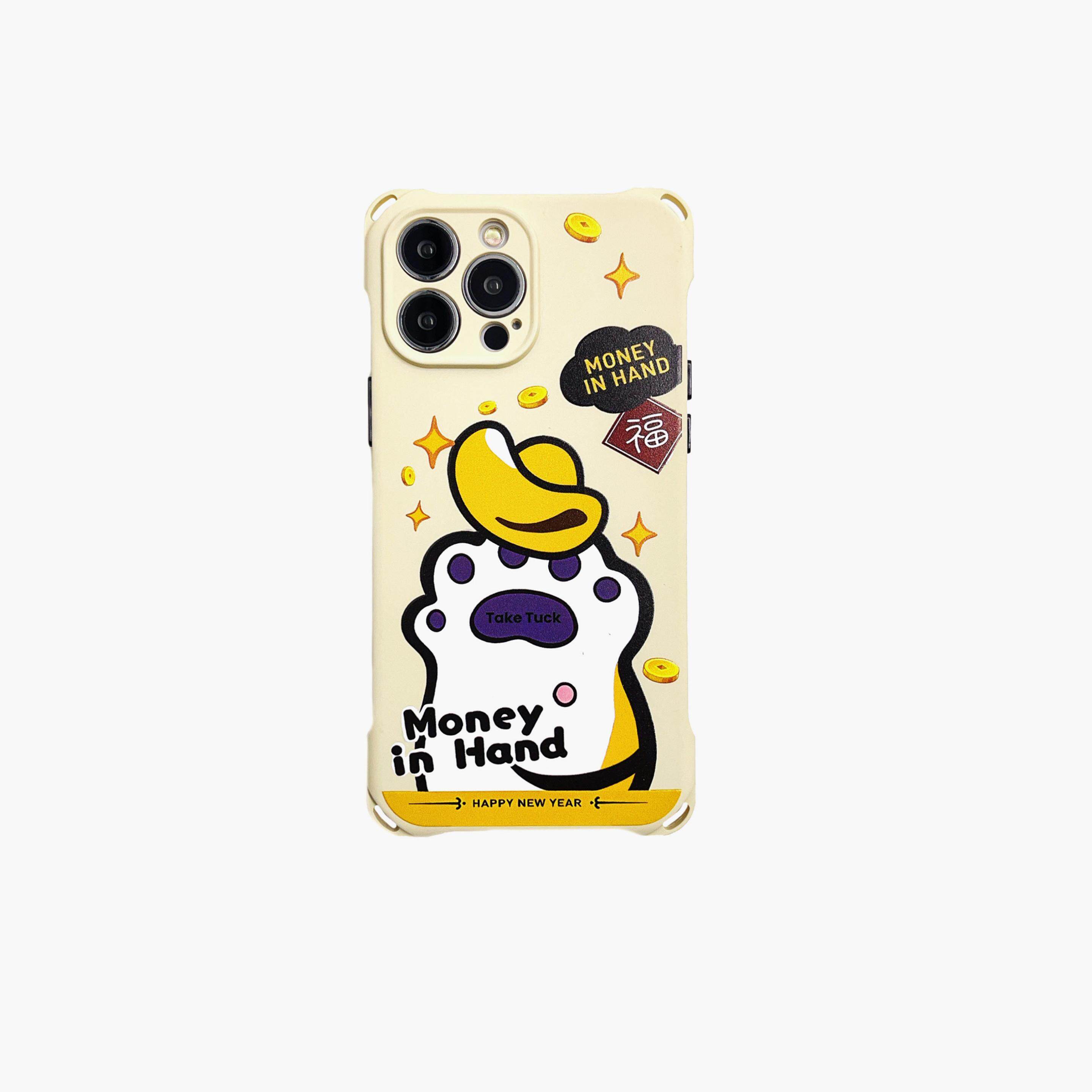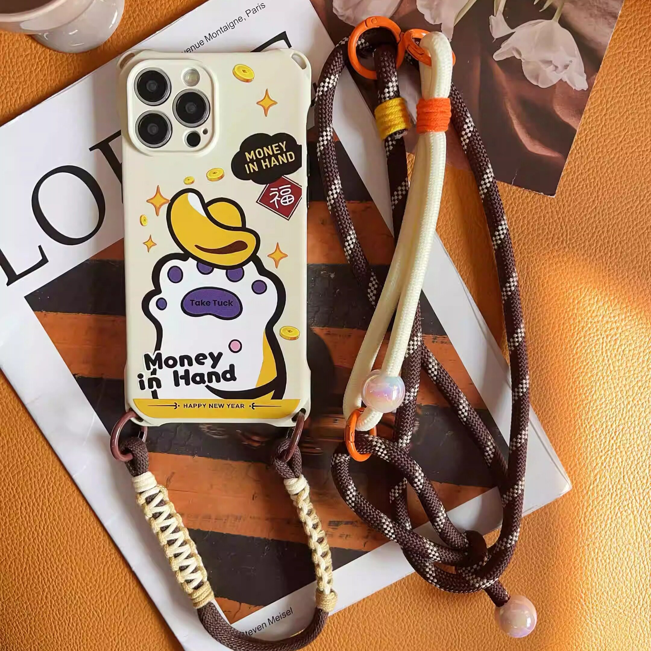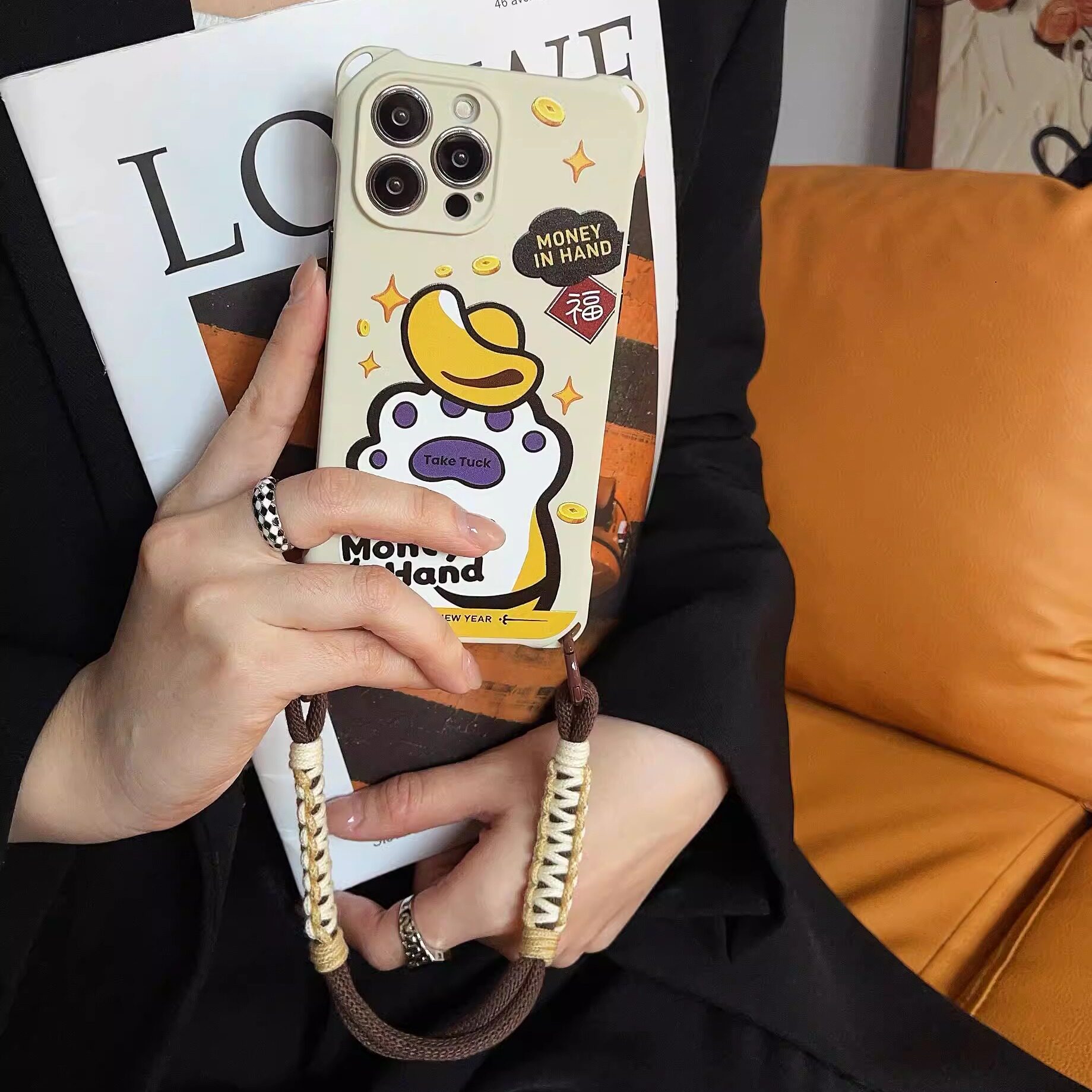 胖虎元宝卡通创意卡通斜跨手机壳适用苹果16promax古董白可爱搞怪mate60pro四角开孔全包小米15Pro硅胶软防摔
